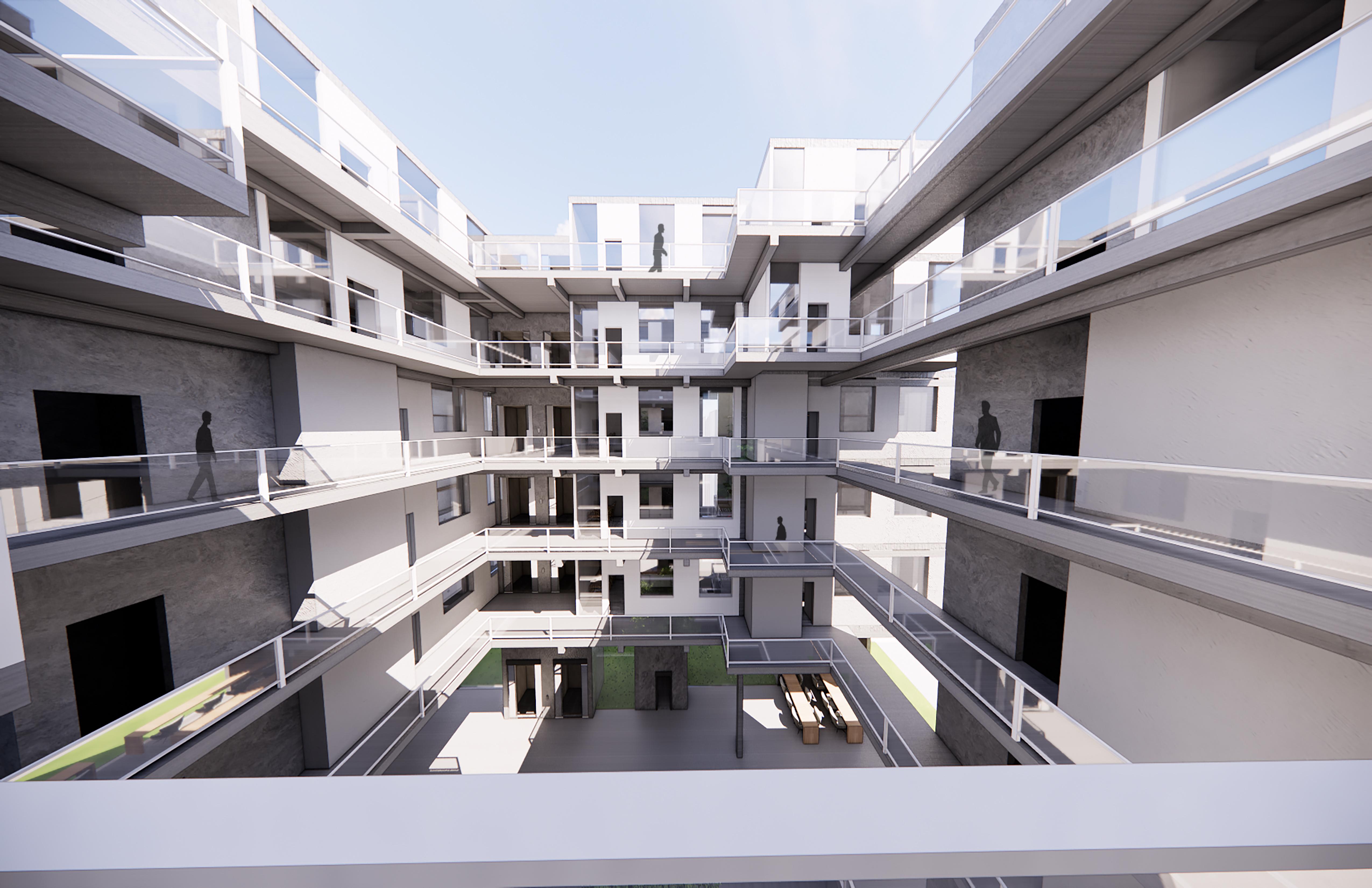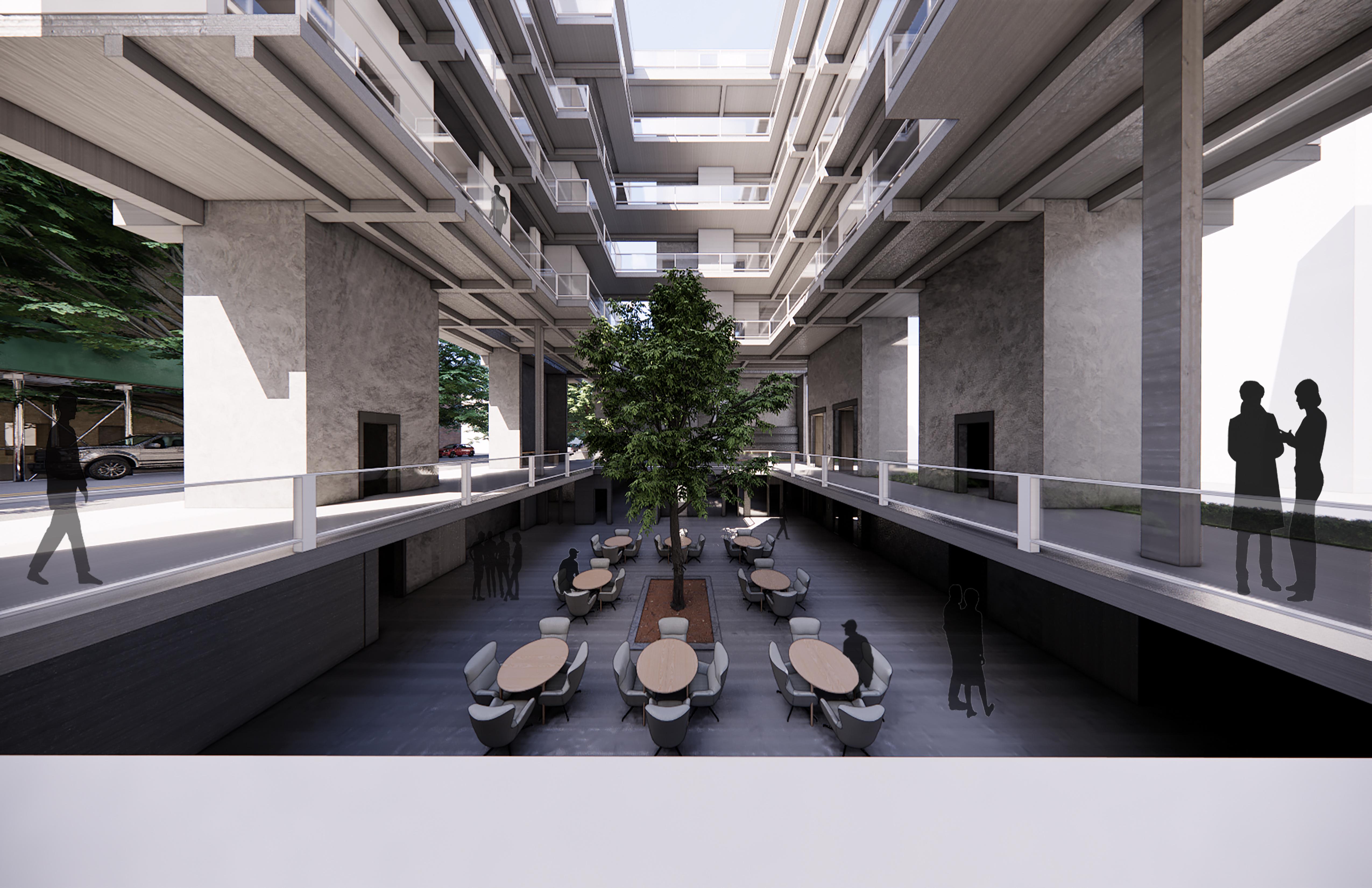 - CAST-IN-PLACE FLAT PLANES: Concrete molds filled in on-site. Circulation paths that connect the units on each floor are included to provide more seismic and wind resistance.