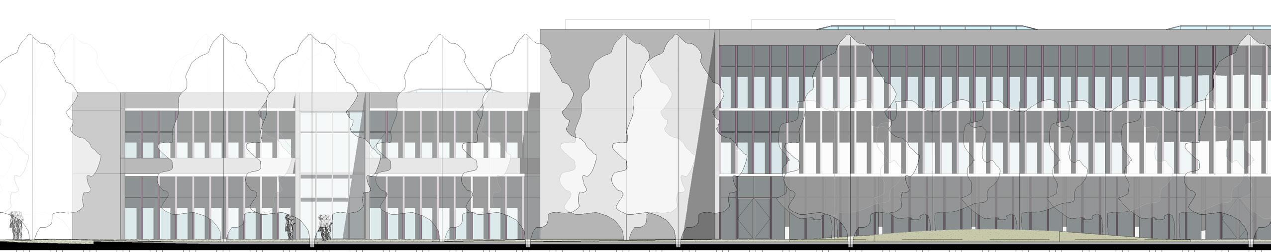 View of south facade along the length of building.