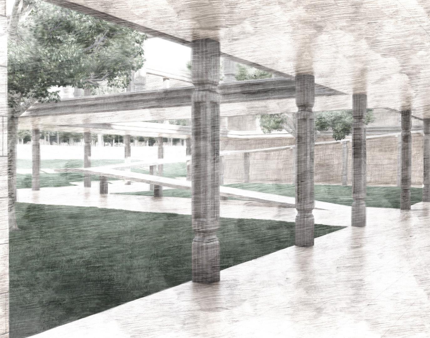 Collonade passage along the street leading to complex.