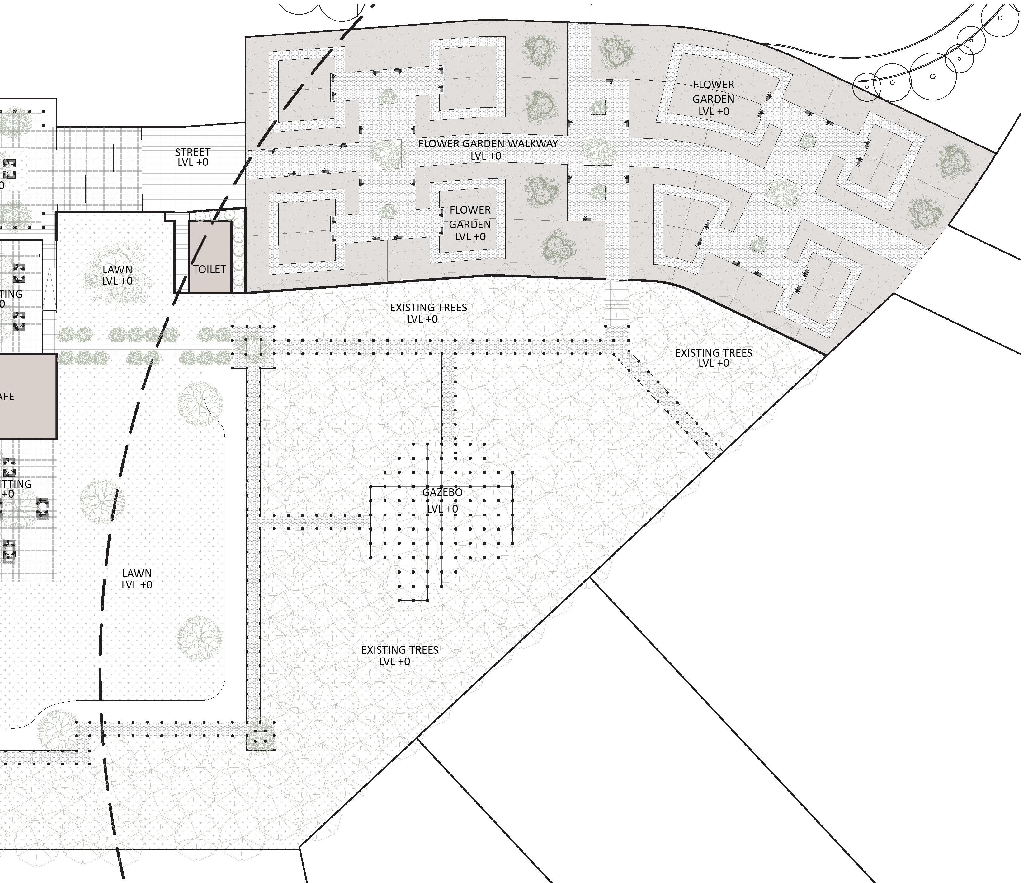 • The upper level adjacent towards the east side would form indirect amphitheater which could be utilized for conducting yoga sessions and other recreational activities.