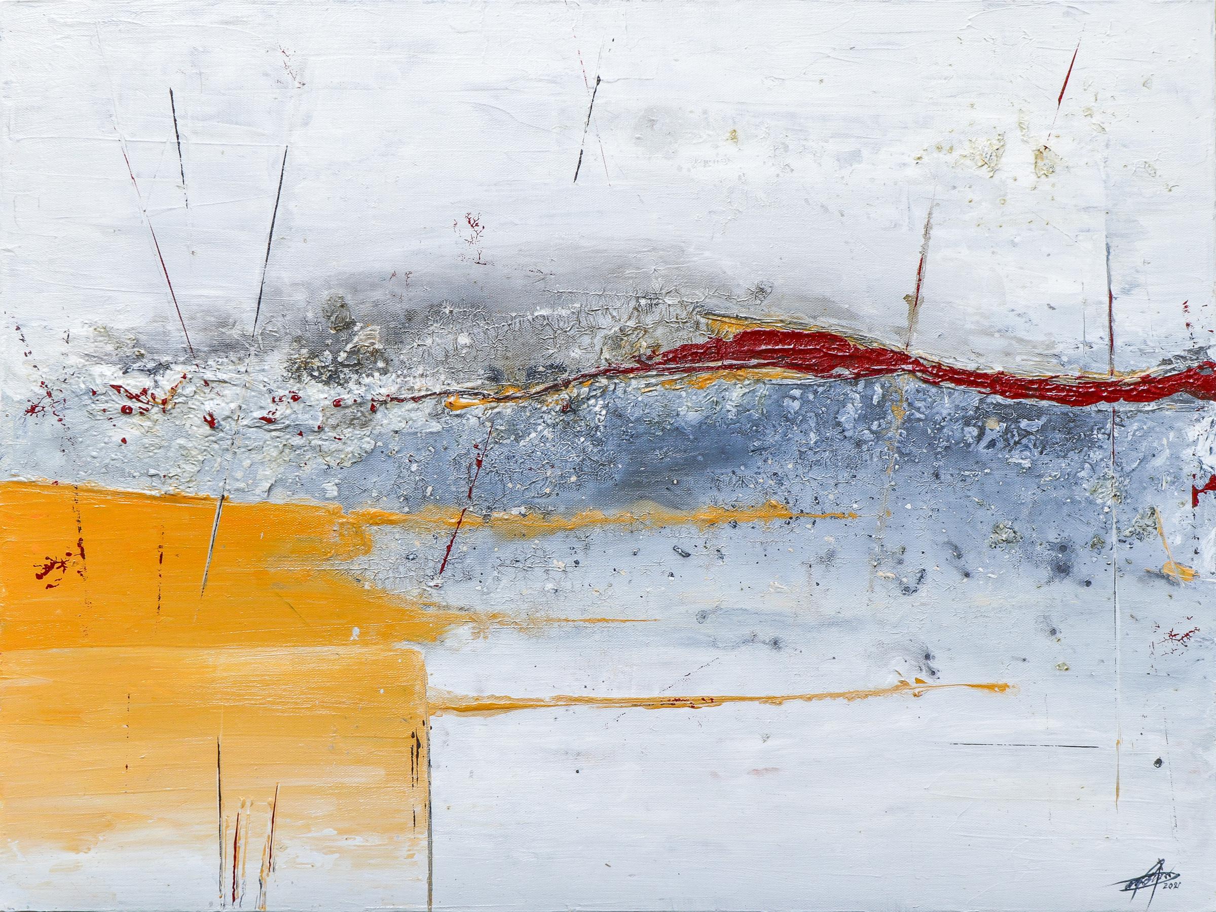 There is another strand to Scalcon’s practice, one more rooted in nature. With these pieces, he does title them, to encourage the viewer to see what he sees. His ‘abstract’ series is an exploration of views or landscapes. These subjects appear in his mind suddenly, accompanied by an urge to transcribe them in paint. Vistas such as misty Swiss lakes, coral reefs and mountain forests, often inspired by places he has travelled to, are the inspirations for this series of work. With these paintings, he has developed a multi-media technique of incorporating 3-d materials to highlight the tangibility of the landscape. This exploration of tactility has informed a thicker application of paint in his contemporary work. It produces a sensual connection to the surface. He values the tangibility of this reaction, seeing it as an antidote to experiencing art through screens and social media. The relationship with the viewer is what Scalcon values most of all, saying: ‘the fact that a painting can create a genuine connection with someone is an achievement in itself.’