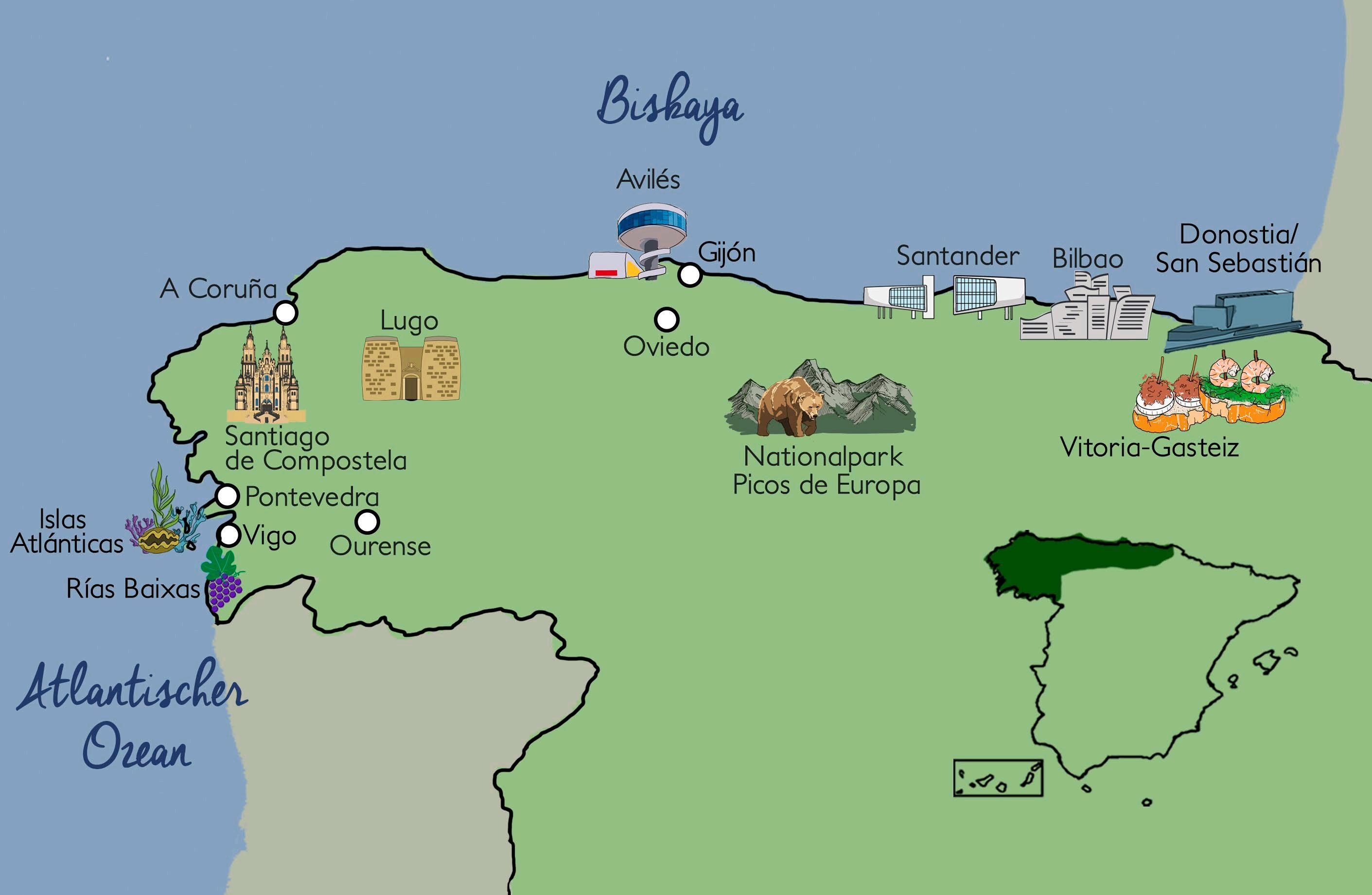 Pulsierende Städte wie San Sebastián, Santander, Gijón und Santiago de Compostela werden Sie fesseln. Nutzen Sie das unerschöpfliche kulturelle Angebot, besichtigen Sie jahrhundertealte Kathedralen oder staunen Sie in avantgardistischen Museen. Und genießen Sie am Ende des Tages das intensive Nachtleben von Universitätsstädten wie Bilbao oder Oviedo All das und vieles mehr erwartet Sie im grünen Spanien. Erleben Sie die Schönheit und Magie dieser traumhaften Landschaft und entdecken Sie alles, was sie Ihren Sinnen bietet.