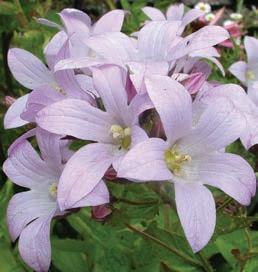 A stunning hybrid of C.punctata and C.trachelium. Forms a spreading clump of large, mid green, toothed leaves with many clusters of huge, deep green, pendant, bell flowers held just above the foliage in summer.