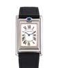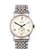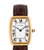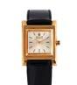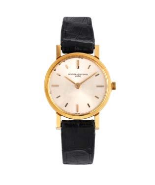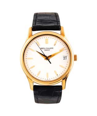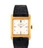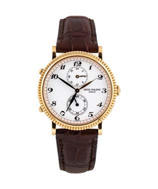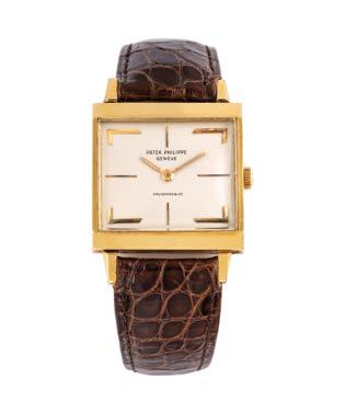 Note: Orologio solo tempo con cassa a scalino in oro giallo 18kt. Quadrante argenté con numeri arabi, piccoli secondi ad ore sei. Sfere a gladio. Vetro minerale curvo. Cinturino in pelle, fibbia in oro giallo 18kt Patek Philippe.