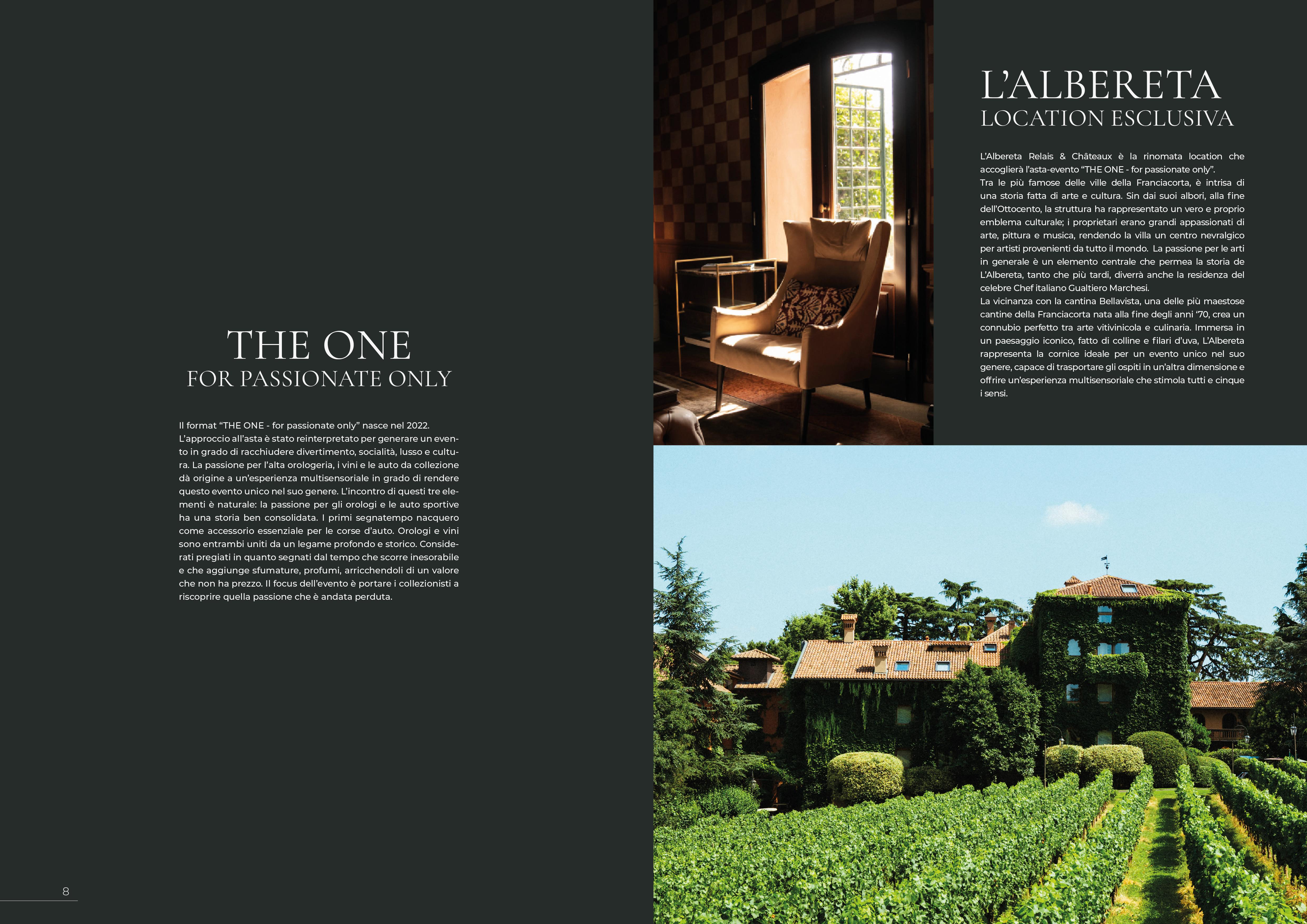 L’orologeria incontrerà il mondo del vino e delle auto da collezione, nella suggestiva location dell’Albereta Relais & Châteaux nel cuore della Franciacorta, già sede dello Chef Gualtiero Marchesi, circondata dai vigneti di Bellavista.