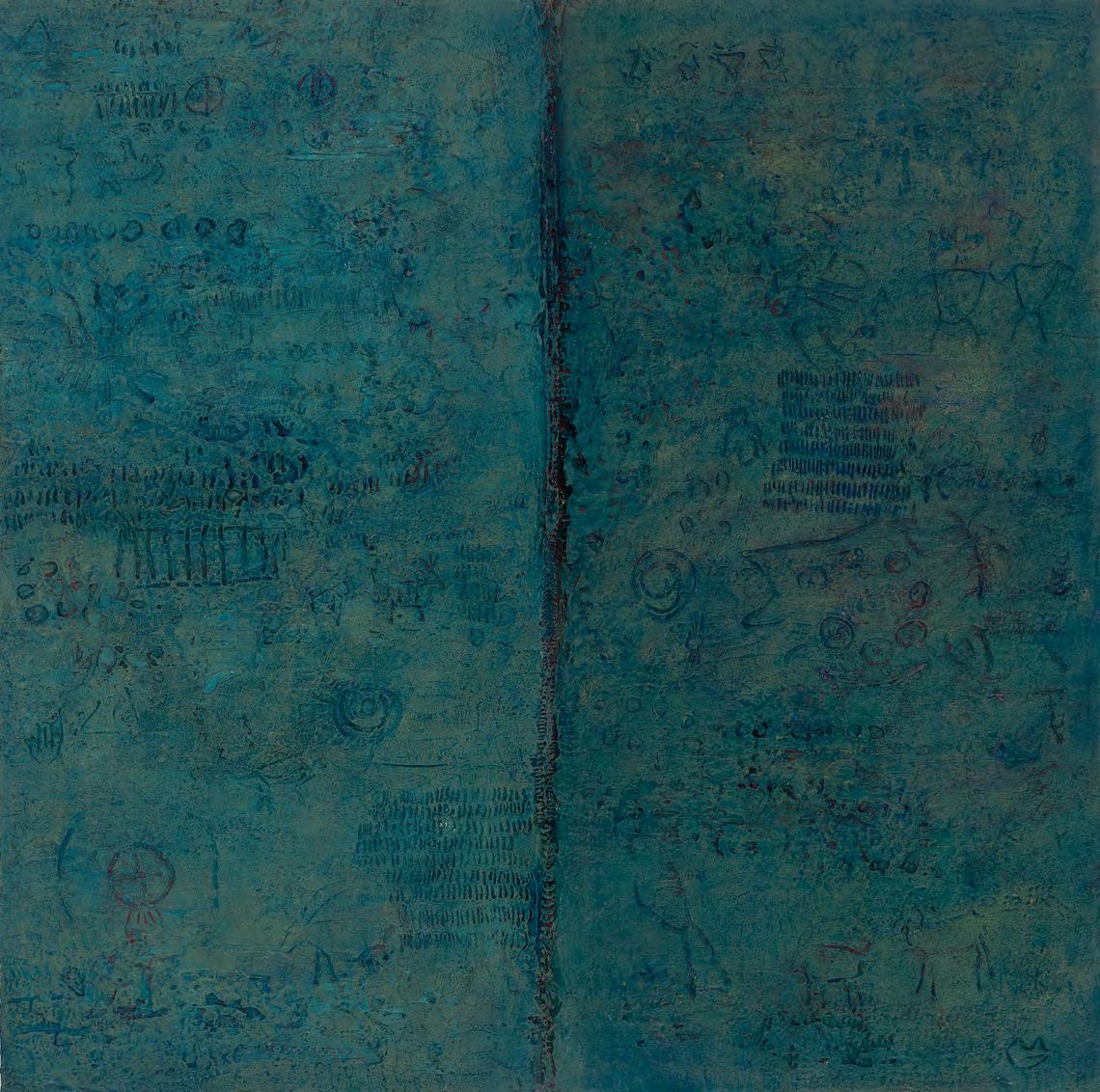 SymbolsBeforeMyEyes, 1996, Acrylic paint and paste on canvas, 36 x 36 inches Signed, titled, and dated on the verso
