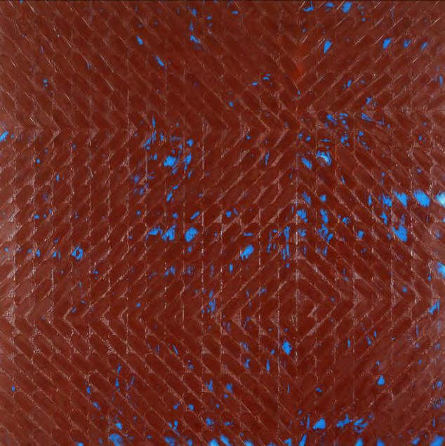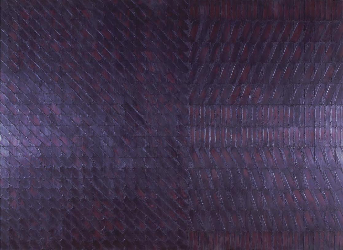 In the beginning, she would partition vertically oriented painting into stacked horizontal bands of muted colors that were close in hue and value but by 1977, she became fixated on pattern, relying, as always, on the grid as her structuring device. It would be scored into the painting’s surface as a scaffold of sorts, a field often divided into halves, thirds, or quadrants. The grid was filled in by applications of encaustic to form herringbone-like sequences of impressed marks. There is a handsome triptych (1980569) in shades that seem an evocation of a misty morning (barely there grey, green, and violet). Each panel is imprinted with the allover herringbone pattern of that period, and linked together by a delicately incised, geometric design that appears in all three panels. Some others from the 1980s are more robust, notable for the richness, the umami, of their saturated colors--the sumptuous purpled blue of Garnet (1983), warmed by an undertone of red; Navajo(1984), its oxblood field flickered by turquoise blue, a nod to the palette of native American arts; and the beautiful Twilight (1986-87), its afterglow of day’s blues twinkling in the light lingering against the tessera-like surface.