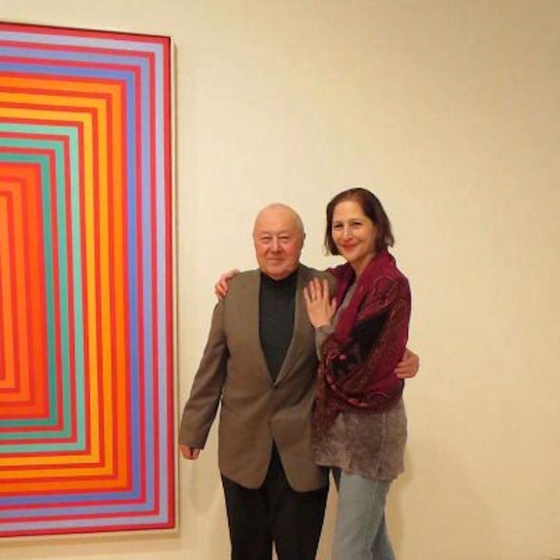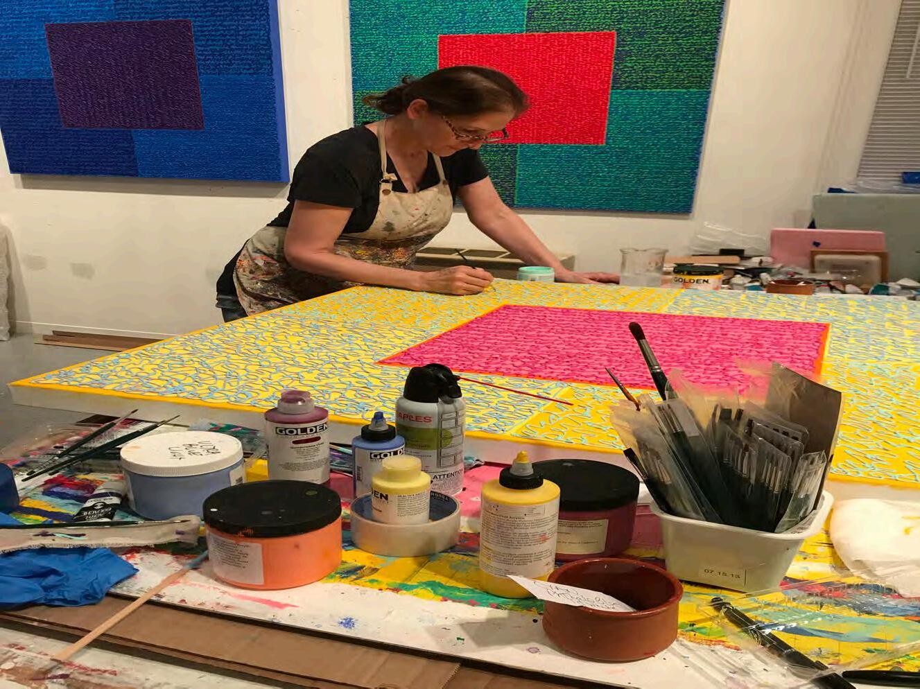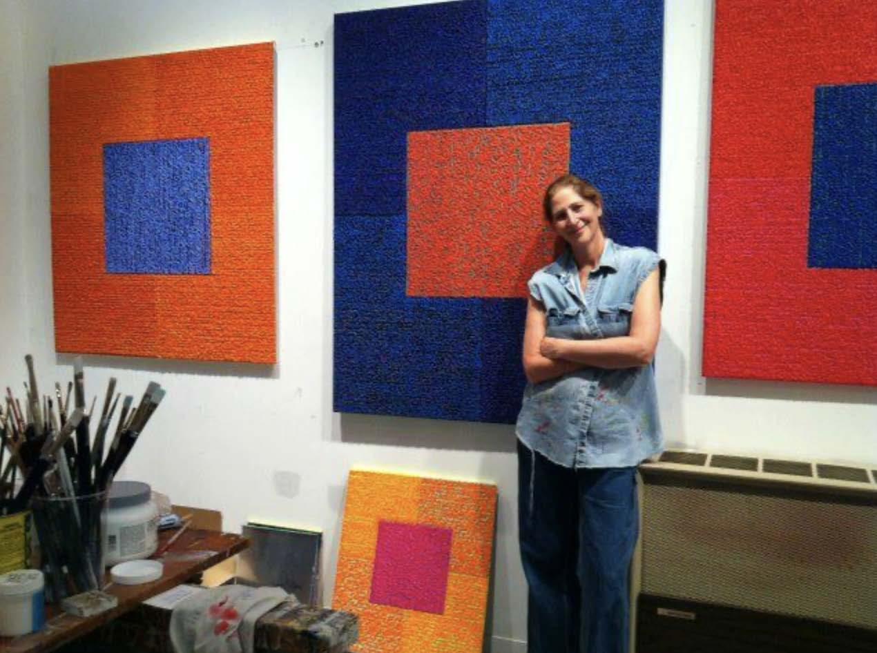 An artist of independent mind, Sloane is a feminist but does not directly refer to the gender wars that have roiled the recent past. Among the few women abstractionists who made the kind of work Sloane was interested in was Agnes Martin, a groundbreaking figure who occupies a prominent place in the upper tiers of her pantheon of great artists. Her early influences, however, were mostly male, by default, as were those of many women artists of her generation (who were finally banding together to demand the long overdue acknowledgment they merited). She was much drawn to the moody and extraordinarily sensuous encaustic paintings of Brice Marden, the buoyant canvases of Morris Louis, and the clean geometries of Josef Albers, early Frank Stella, and Richard Anuszkiewicz. Anuszkiewicz, whom she admired, in a memorable exchange that took place in the early 2000s, encouraged her to use more, and more explosive colors. Sloane was all in, in what was essentially a kind of weaponizing of divisionism: the juxtaposition of complementary or high contrast colors that was blended by the eye, creating the maximum brilliance possible where they met, equivalent to the shimmer of actual light. A phenomenon observed by Michel-Eugène Chevreuil, it was the definitive technique adopted by Post-Impressionists such as Georges Seurat.
