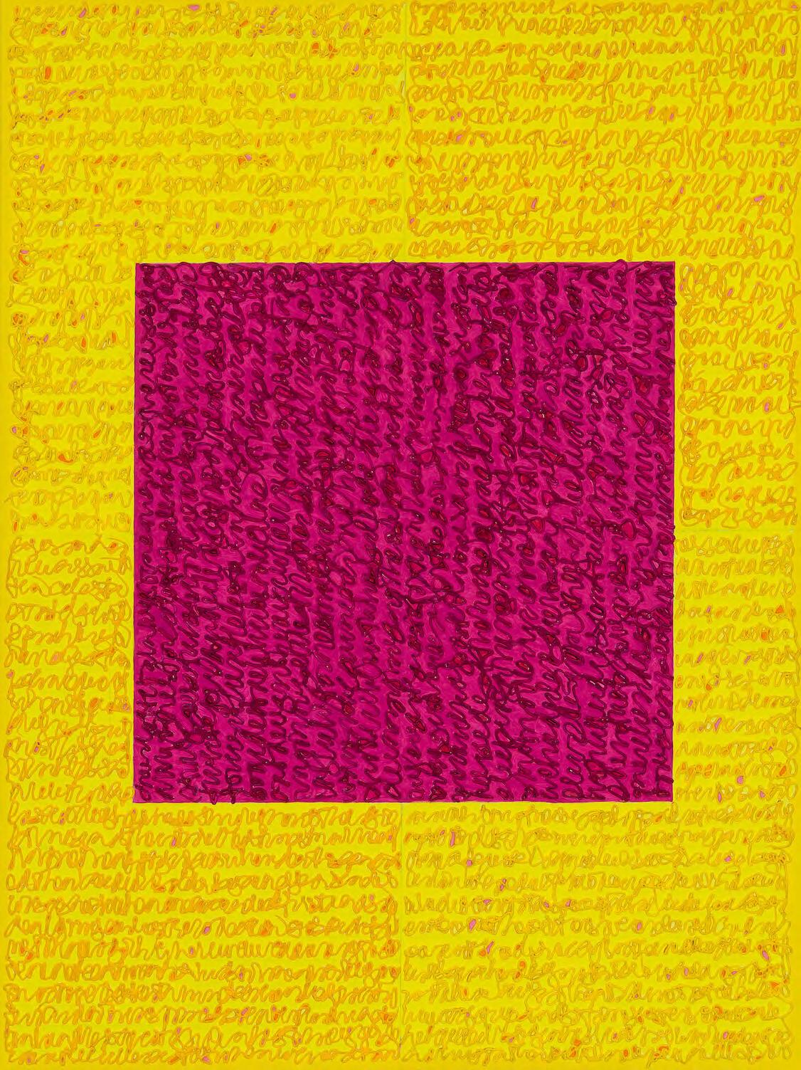 In the decade before this, her inquiries resulted in the adaptation of a square within a square or a square within a rectangle that has become a signature motif. Over the years, the range of colors found within a single painting has expanded and her colors have brightened, seismically escalating in impact.Celeste (2018), for example, trumpets a blast of red and yellow, andDangerzone (2018), thrusts an intense, highpitched red square into the viewer’s space that looks as if it is ready to detonate. Diamond shapes, another modernist staple evoking Mondrian as well as Malevich, have also been added to her lexicon. Sloane began thinking about Suprematism some time ago, and more recently, about the paintings of symbolist artist Hilma af Klint, both characterized by a formality glossed with the mystical. Mondrian and Malevich inspired her to tilt the square, animating the surface further, pushing her paintings into a new direction. One of the most recent works in the exhibition isAscension (2022), its red, yellow and blue downshifted into lavender, baby blue, and a yellow red that becomes an orange of sorts. It is quieter, although the composition is still divided into quadrants and embellished with an allover pattern of raised, calligraphic twists. The contrast in color is far less extreme, permitting field and pattern to inhabit their shared space far more decorously. In the foreground are three diamonds that seem to be wafting upward weightlessly, the overall impression is that of the formal and the material translated into a more mystical state, touched by grace.
