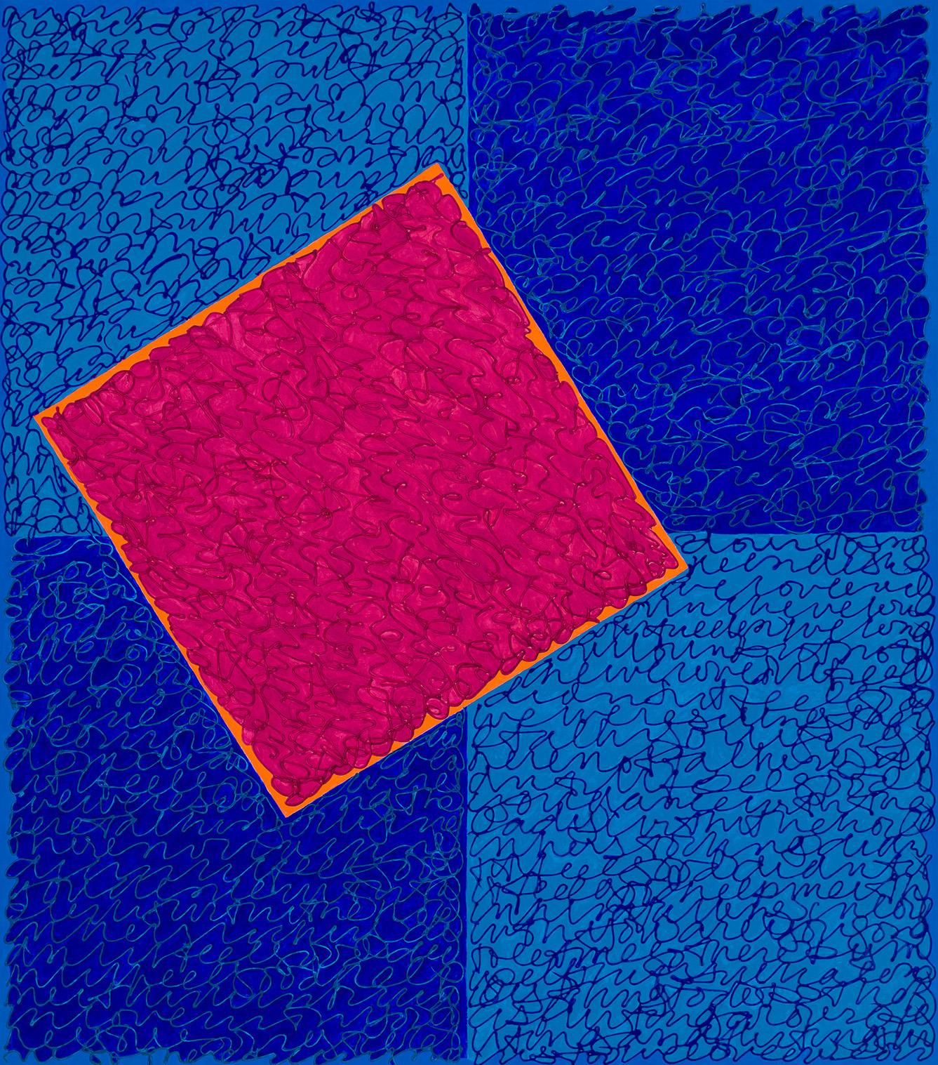 Sloane, during her long career, has experimented with monochrome, Op Art, Color Field, P & D, and geometric abstraction—of the soft-edged variety, not hard, embellished by the addition of other imagery, such as text, but so overwritten it looks like filagree. Geometric abstraction has been typical of her practice since around the late 1990s – early 2000s, a style that is enjoying a surge of renewed interest. She Intentionally adopted an artisanal, handmade approach for its differences, surprises. (We are not robots, after all.) And despite working in series, each painting is autonomous, sustained by its own substantial presence, although she might rev up its punch level by employing a multiple-panel format.