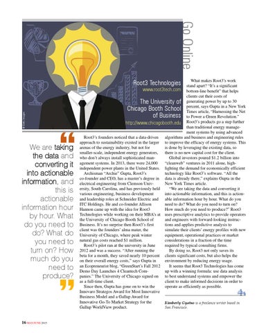 What makes Root3’s work stand apart? “It’s a significant bottom-line benefit” that helps clients cut their costs of generating power by up to 30 percent, says Gupta in a New York Times article, “Harnessing the Net to Power a Green Revolution.” http://www.chicagobooth.edu Root3’s products go a step further than traditional energy management systems by using advanced Root3’s founders noticed that a data-driven algorithms and business and engineering rules approach to sustainability existed in the larger to improve the efficacy of energy systems. This arenas of the energy industry, but not for is done by leveraging the existing data, so smaller-scale, independent energy generators, there is no new capital cost for the client. who don’t always install sophisticated manGlobal investors poured $1.2 billion into agement systems. In 2013, there were 24,000 “cleanweb” ventures in 2011 alone, highindependent power plants in the United States. lighting the demand for economically efficient Archisman “Archie” Gupta, Root3’s technology like Root3’s software. “All the co-founder and CEO, has a master’s degree in data is already there,” explains Gupta in the electrical engineering from Clemson UnivNew York Times article. ersity, South Carolina, and has previously held “We are taking the data and converting it various engineering, business development into actionable information, and this is actionand leadership roles at Schneider Electric and able information hour by hour. What do you ITC Holdings. He and co-founder Allison need to do? What do you need to turn on? Hannon came up with the idea for Root3 How much do you need to produce?” Root3 Technologies while working on their MBA’s at uses prescriptive analytics to provide operators the University of Chicago Booth School of and engineers with forward-looking instrucBusiness. It’s no surprise then Root3’s first tions and applies predictive analysis to client was the founders’ alma mater, the simulate their clients’ energy profiles with new University of Chicago, where peak winter equipment, operational practices or market natural gas costs reached $1 million. considerations in a fraction of the time Root3’s pilot ran at the university in June required by typical consulting firms. 2012 and was a success. “After running the By doing so, Root3 not only saves its beta for a month, they saved nearly 10 percent clients significant costs, but also helps the on their overall energy costs,” says Gupta in environment by reducing energy usage. an Ecopreneurist blog, “GreenStart’s Fall 2012 It seems that Root3 Technologies has come Demo Day Launches 4 Cleantech Comup with a winning formula: use data analysis panies.” The University of Chicago signed on to best understand systems and empower the as a full-time client. client to make informed decisions in order to Since then, Gupta has gone on to win the operate as efficiently as possible. Innovaro Strategos Award for Most Innovative Business Model and a Gallup Award for Innovative Go-To Market Strategy for the Kimberly Gyatso is a freelance writer based in San Francisco. Gallup WorldView product.