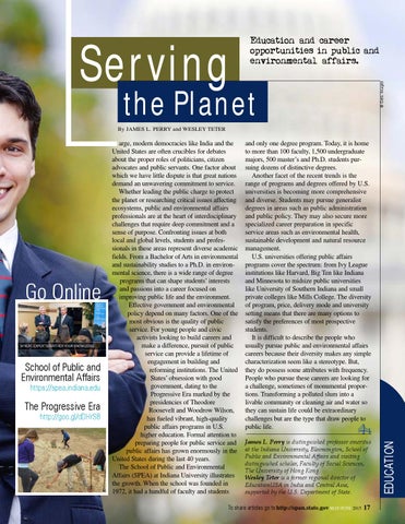 and only one degree program. Today, it is home to more than 100 faculty, 1,500 undergraduate majors, 500 master’s and Ph.D. students pursuing dozens of distinctive degrees. Another facet of the recent trends is the range of programs and degrees offered by U.S. universities is becoming more comprehensive and diverse. Students may pursue generalist degrees in areas such as public administration and public policy. They may also secure more specialized career preparation in specific service areas such as environmental health, sustainable development and natural resource management. U.S. universities offering public affairs programs cover the spectrum: from Ivy League institutions like Harvard, Big Ten like Indiana and Minnesota to midsize public universities like University of Southern Indiana and small private colleges like Mills College. The diversity of program, price, delivery mode and university setting means that there are many options to satisfy the preferences of most prospective students. It is difficult to describe the people who usually pursue public and environmental affairs careers because their diversity makes any simple characterization seem like a stereotype. But, they do possess some attributes with frequency. People who pursue these careers are looking for a challenge, sometimes of monumental proportions. Transforming a polluted slum into a livable community or cleaning air and water so they can sustain life could be extraordinary challenges but are the type that draw people to public life. James L. Perry is distinguished professor emeritus at the Indiana University, Bloomington, School of Public and Environmental Affairs and visiting distinguished scholar, Faculty of Social Sciences, The University of Hong Kong. Wesley Teter is a former regional director of EducationUSA in India and Central Asia, supported by the U.S. Department of State.