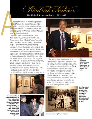 mbassador Richard R. Verma inaugurated the “Kindred Nations: The United States and India, 1783-1947” exhibition at the India Habitat Centre in New Delhi on March 12. The exhibit, which was later displayed at the American Center in April, will travel to other cities in India. Curated by Meridian International Center, Washington, D.C., with support from the U.S. Department of State, “Kindred Nations” presents historical images that recall tales of remarkable people—some well known, others awaiting rediscovery. These stories convey the range of U.S.India interactions across many domains. Although the photographs and documents capture individual experiences, each narrative offers insight into crossfertilizations between the United States and India that helped shape both countries. “The images in this exhibition—of leaders, merchants, immigrants, artists, educators and students—show that the friendship between both nations is built on a foundation of shared respect,” Ambassador Stuart Holliday, president and CEO of the Meridian International Center, said in a message on the exhibit.