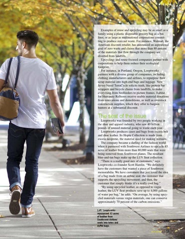 The seat of the issue Looptworks was founded by two people working in the shoe and apparel industry, who saw 40 billion pounds of unused material going to waste each year. Looptworks produces cases and bags from excess belt and shoe leather. Its Hoptu Collection is made from excess neoprene, the material used for making wetsuits. The company became a darling of the fashion world when it partnered with Southwest Airlines to upcycle 43 acres of leather from more than 80,000 seats that were being removed from Southwest planes. The resultant blue-and-tan bags make up the LUV Seat collection. “There is a really good mix of customers,” says Looptworks co-founder Scott Hamlin. “We definitely have the customers that wanted a piece of Southwest memorabilia. We have customers that just loved the idea of a bag made from an airline seat; the customer that supports the upcycling movement; and then, the customer that simply thinks it’s a really cool bag.” “By using upcycled leather, as opposed to virgin leather, the LUV Seat products save up to 4,000 gallons of water per bag,” he adds. “On average, by using upcycled materials versus virgin materials, one can conserve approximately 70 percent of the carbon emissions.” Left: Looptworks repurposed 43 acres of leather from Southwest Airlines’ seats into totes and duffel bags. MAY/JUNE 2015 23