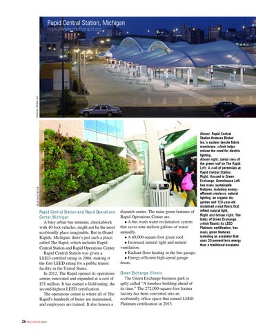 Above: Rapid Central Station features Birdair Inc.’s custom tensile fabric membrane, which helps reduce the need for electric lighting. Above right: Aerial view of the green roof on The Rapid. Left: A wall of perennials at Rapid Central Station. Right: Housed in Green Exchange, Greenhouse Loft has many sustainable features, including energyefficient windows, natural lighting, an organic sky garden and 120-year-old reclaimed wood floors that reflect natural light. Right and below right: The lobby of Green Exchange, which flaunts its LEED Platinum certification, has many green features, including an escalator that uses 30 percent less energy than a traditional escalator.