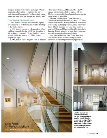 of the Grand Rapids Art Museum. The 125,000square-foot museum, which occupies a full city block, was designed to be as beautiful on the outside as the works of art within. The new building of the Grand Rapids Art Museum was designed specifically with LEED Gold certification in mind. Making a museum ecofriendly is especially challenging because, unlike other structures, it has to maintain a specific temperature, 24 degrees Celsius and 50 percent humidity, in order to keep the delicate artworks in good shape. Museums expend energy maintaining that balance. According to Inhabitat.com, Grand Rapids Art Museum’s climate “is controlled by excellent insulation and building materials (20 percent of