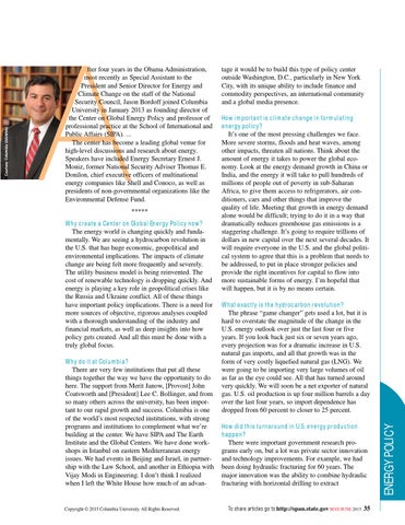 ***** Why create a Center on Global Energy Policy now? The energy world is changing quickly and fundamentally. We are seeing a hydrocarbon revolution in the U.S. that has huge economic, geopolitical and environmental implications. The impacts of climate change are being felt more frequently and severely. The utility business model is being reinvented. The cost of renewable technology is dropping quickly. And energy is playing a key role in geopolitical crises like the Russia and Ukraine conflict. All of these things have important policy implications. There is a need for more sources of objective, rigorous analyses coupled with a thorough understanding of the industry and financial markets, as well as deep insights into how policy gets created. And all this must be done with a truly global focus. Why do it at Columbia? There are very few institutions that put all these things together the way we have the opportunity to do here. The support from Merit Janow, [Provost] John Coatsworth and [President] Lee C. Bollinger, and from so many others across the university, has been important to our rapid growth and success. Columbia is one of the world’s most respected institutions, with strong programs and institutions to complement what we’re building at the center. We have SIPA and The Earth Institute and the Global Centers. We have done workshops in Istanbul on eastern Mediterranean energy issues. We had events in Beijing and Israel, in partnership with the Law School, and another in Ethiopia with Vijay Modi in Engineering. I don’t think I realized when I left the White House how much of an advan-
