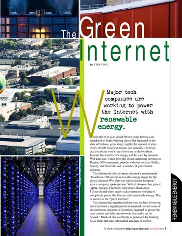 ithin the next year, about 60 new wind turbines are scheduled to begin whirling above flat farmland in the state of Indiana, generating roughly the amount of electricity 46,000 American homes use annually. However, that electricity won’t run televisions or dishwashers. Instead, the wind farm’s energy will be used by Amazon Web Services, which provides cloud computing services to Fortune 500 companies; popular websites such as Netflix, Spotify and Pinterest; and, a number of government agencies. The Indiana facility advances Amazon’s commitment “to achieve 100 percent renewable energy usage for the global Amazon Web Services infrastructure footprint,” says a company spokesperson. With it, Amazon has joined Apple, Google, Facebook, Salesforce, Rackspace, Microsoft and other major tech companies working to completely power the Internet with renewable energy. This is known as the “green Internet.” The Internet has transformed the way we live. However, there has been a significant environmental cost in terms of the enormous amounts of electricity required to power the data centers and telecom networks that make up the “cloud.” Much of that electricity is generated by burning fossil fuels that emit substantial amounts of carbon To share articles go to http://span.state.gov MAY/JUNE 2015 5