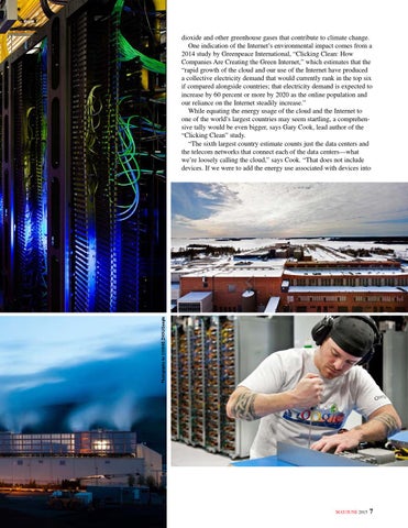 dioxide and other greenhouse gases that contribute to climate change. One indication of the Internet’s environmental impact comes from a 2014 study by Greenpeace International, “Clicking Clean: How Companies Are Creating the Green Internet,” which estimates that the “rapid growth of the cloud and our use of the Internet have produced a collective electricity demand that would currently rank in the top six if compared alongside countries; that electricity demand is expected to increase by 60 percent or more by 2020 as the online population and our reliance on the Internet steadily increase.” While equating the energy usage of the cloud and the Internet to one of the world’s largest countries may seem startling, a comprehensive tally would be even bigger, says Gary Cook, lead author of the “Clicking Clean” study. “The sixth largest country estimate counts just the data centers and the telecom networks that connect each of the data centers—what we’re loosely calling the cloud,” says Cook. “That does not include devices. If we were to add the energy use associated with devices into