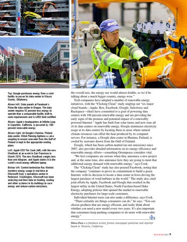 Top: Google purchases energy from a wind facility to power its data center in Mayes County, Oklahoma. Above left: Solar panels at Facebook’s Prineville data center in Oregon. The data center requires 52 percent less energy to operate than a comparable facility built to code requirements and is LEED Gold certified. Above: Apple’s headquarters at Infinite Loop in Cupertino, California, is powered by 100 percent renewable energy. Above right: At Google’s Hamina, Finland data center, Mitch Fleming tightens a valve coupling to ensure seawater from the Gulf of Finland is kept in the appropriate cooling pipes. Left: Apple CEO Tim Cook (left) with the new MacBook at an event in San Francisco in March 2015. The new MacBook weighs less than one kilogram, and Apple claims it is the world’s most energy-efficient laptop. Below left: Control technician Ray Nichols monitors energy usage in real-time at Microsoft Corp.’s operations center in Redmond, Washington. Microsoft has been analyzing real-time data on heating, cooling and other systems in its buildings to save energy and reduce carbon emissions.