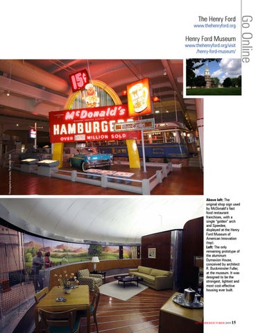 Above left: The original shop sign used by McDonaldâs fast food restaurant franchises, with a single âgoldenâ arch and Speedee, displayed at the Henry Ford Museum of American Innovation (top). Left: The only remaining prototype of the aluminum Dymaxion House, conceived by architect R. Buckminster Fuller, at the museum. It was designed to be the strongest, lightest and most cost-effective housing ever built.