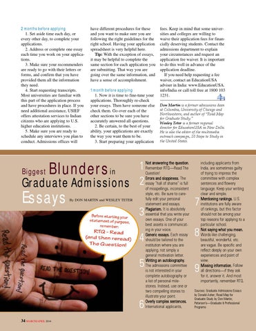 fees. Keep in mind that some universities and colleges are willing to waive their application fees for financially deserving students. Contact the admissions department to explain your circumstances and request an application fee waiver. It is important to do this well in advance of the application deadline. If you need help requesting a fee waiver, contact an EducationUSA adviser in India: www.EducationUSA. info/India or call toll free at 1800 103 1231. Don Martin is a former admissions dean at Columbia, University of Chicago and Northwestern; and author of “Road Map for Graduate Study.” Wesley Teter is a former regional director for EducationUSA in New Delhi. He is also the editor of the multimedia outreach campaign, 10 Steps to Study in the United States.