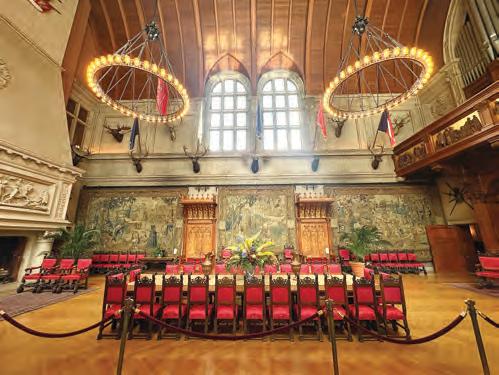 Entering the mansion, the principal rooms of the house are located on the ground floor. To the right of the marbled entrance hall, the octagonal sunken Winter Garden is surrounded by stone archways with a ceiling of sculptured wood and glass. The Banquet Hall is the largest room in the house, measuring 42 ft × 72 ft , with a 70-foot high barrel-vaulted ceiling. The table can seat 64 guests and is surrounded by rare Flemish tapestries and a triple fireplace that spans one end of the hall.