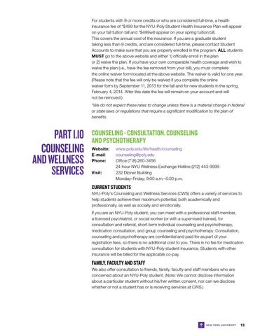 Current Students NYU-Poly’s Counseling and Wellness Services (CWS) offers a variety of services to help students achieve their maximum potential, both academically and professionally, as well as socially and emotionally. If you are an NYU-Poly student, you can meet with a professional staff member, a licensed psychiatrist, or social worker (or with a supervised trainee), for consultation and referral, short-term individual counseling and psychotherapy, medication consultation, and group counseling and psychotherapy. Consultation, counseling and psychotherapy are confidential and paid for as part of your registration fees, so there is no additional cost to you. There is no fee for medication consultation for students with NYU-Poly student insurance. Students with other insurance will be billed for the applicable co-pay.