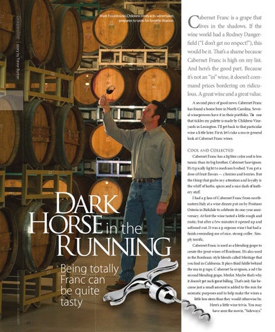 Cool and Collected Cabernet Franc has a lig hter color and is less tannic than its big brother, Cabernet Sauvignon. It’s typically light to medium bodied. You get a dose of fruit flavors — cherries and berries. But the thing that grabs my attention and loyalty is the whiff of herbs, spices and a nice dash of leathery stuff. I had a g lass of Cabernet Franc from northeastern Italy at a wine dinner put on by Positano Osteria in Birkdale to celebrate its one-year anniversary. At first the wine tasted a little rough and rustic, but after a few minutes it opened up and softened out. It was a g orgeous wine t hat had a finish reminding me of nice, strong coffee. Simific. ply terrifi Cabern Cabernet Franc is used as a blending grape to create the great g wines of Bordeaux. It’s also used in the Borde deaux-st blends called Meritage that Bordeaux-style you find in C Califor California. It plays third fiddle behind raape, the ma in ggra pe, C abernet Sa uvignon, a nd t he ing gr second blendin blending grape, Merlot. Maybe that’s why it doesn’t get su such uch ggreat billing. That’s only fair beall amount a cause just a sma small is added to the mix for purposses and to help make the wines a aromatic purposes little less stern n than they would otherwise be. Herr s a little wine trivia. You may Here’ haav seen the movie, “Sideways.” have