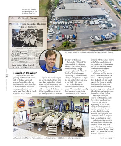 Avenue in 1987. He named the new facility Wher-rena Boatland. A few years later the original marina was sold and eventually became Midtown Sundries and most recently Port City Club. Jeff started working summers at the boat dealership when he was 15. “I did everything from stock shelves to sell skis to put together Sea-Doos,” he says. By then he was also passionate about watersports, including kneeboarding, wakeboarding and riding Jet Skis, and spent as much time as he could on the lake. After high school Jeff went to North Carolina State University where he earned a degree in mechanical engineering. While he had plenty of career options, he says his passion and heart remained with the family business. “I always joked that I did the mechanical engineer degree as my back-up plan.” Sadly, just 10 days after Jeff graduated from college in 2003, his father passed away from cancer. Jeff stepped in and took over the business. “It was a rough period, but I wanted Wher-rena Boatland to succeed.” Continued on page 34