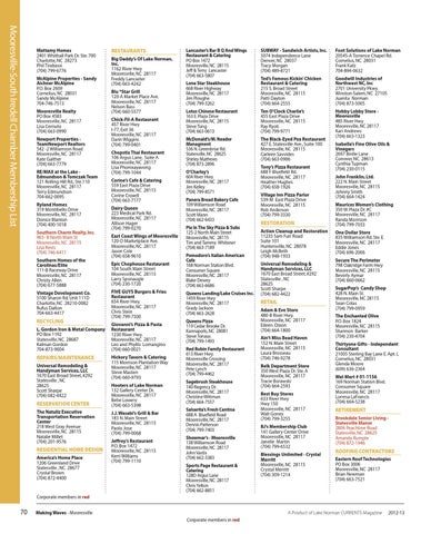 O’Charley’s 604 River Hwy. Mooresville, NC 28117 Jim Kelley (704) 799-8571 Panera Bread Bakery Cafe 109 Williamson Road Mooresville, NC 28117 Scott Mann (704) 662-6433 Pie In The Sky Pizza & Subs 125-2 North Main Street Mooresville, NC 28115 Tim and Tammy Whitener (704) 663-7189 Pomodoro’s Italian American Cafe 168 Norman Station Blvd. Consumer Square Mooresville, NC 28117 Blake Dewey (704) 663-6686 Queens Landing/Lake Cruises Inc. 1459 River Hwy Mooresville, NC 28117 Grady Jackson (704) 663-2628 Queens Pizza 119 Cedar Brooke Dr. Kannapolis, NC 28081 Steve Tonaus (704) 799-1493 Red Robin Family Restaurant 613 River Hwy. Mooresville Crossing Mooresville, NC 28117 Pete Lynch (704) 799-4462 Sagebrush Steakhouse 140 Regency Dr. Mooresville, NC 28117 Christine Wittman (704) 664-7557 Salsarita’s Fresh Cantina 688 A Bluefield Road Mooresville, NC 28117 Dennis Patterson (704) 799-7403 Showmar’s - Mooresville 138 Williamson Road Mooresville, NC 28117 John Vastis (704) 662-3383 Sports Page Restaurant & Catering 128D Argus Lane Mooresville, NC 28117 Chris Yelton (704) 662-8851