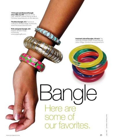 14-kt opal and diamond bangle circa 1960, $2,700, Treasures on the Lake, 19900 W. Catawba Avenue, #106-A, Cornelius, www.treasures-on-the-lake.com. The disco bangle, $12, Francesca’s Collections, Birkdale Village, Huntersville, www.francescascollections.com. Pink and green bangle, $24, Poppies, Birkdale Village, Huntersville, www.poppiesgifts.com. Assorted colored bangles, $9 each, The Jewel Box; Birkdale Village, Huntersville and Jetton Village, Cornelius, www.projewel.com.