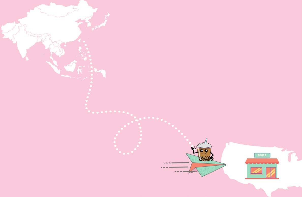 Boba tea traveled to the United States through Taiwainese immigrants. During this time of huge Taiwanese immigration, many Asian immigrants formed cultural neighborhoods in many big cities. Some entrepreneurs saw an opportunity to create a business for the lack of food from home and opened up boba cafes in these cul tural neighborhoods. Being located in the United States, these shop owners had to cater to the sweeter tooth of the American consumer. By experimenting with different syrups, flavors, and toppings the original milk tea boba evolved into today’s modern version of boba.