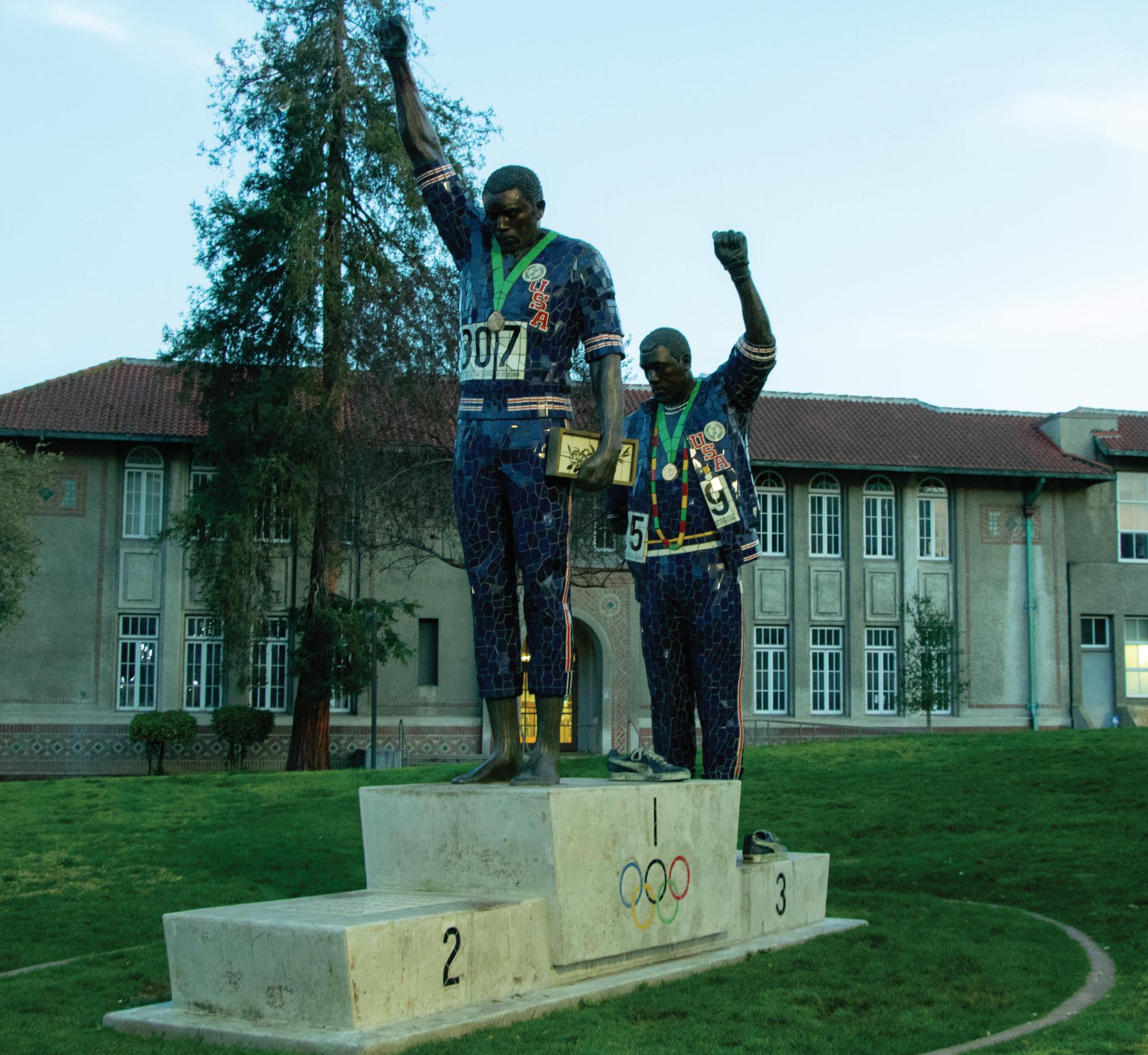 The Olympic Black Power Statue depicts Olympic athletes Tommie Smith and John Carlos at the 1968 medal ceremony.
