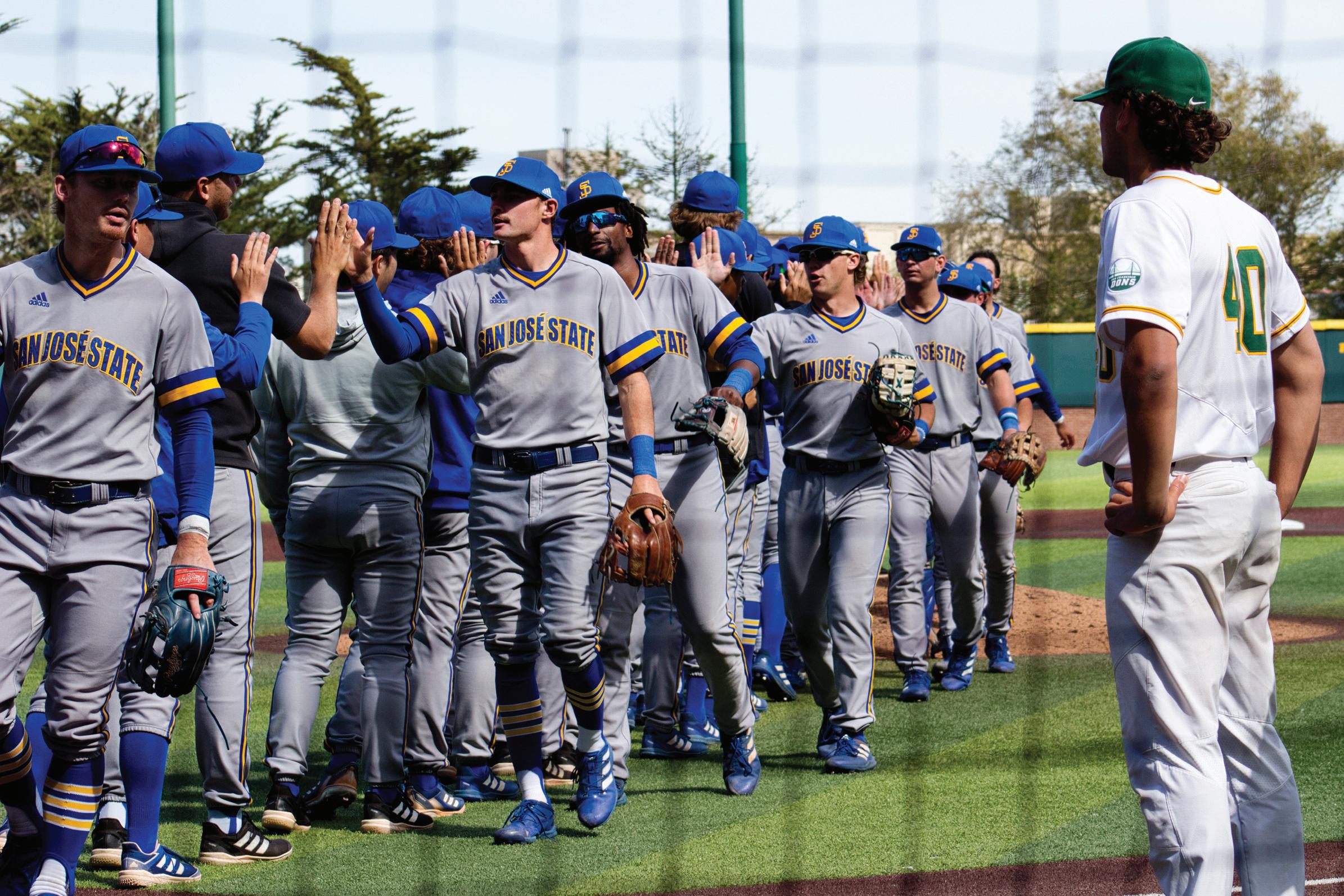 The San Jose State baseball team celebrates after beating the University of San Francisco 12-3 Tuesday at the Benedetti Diamond