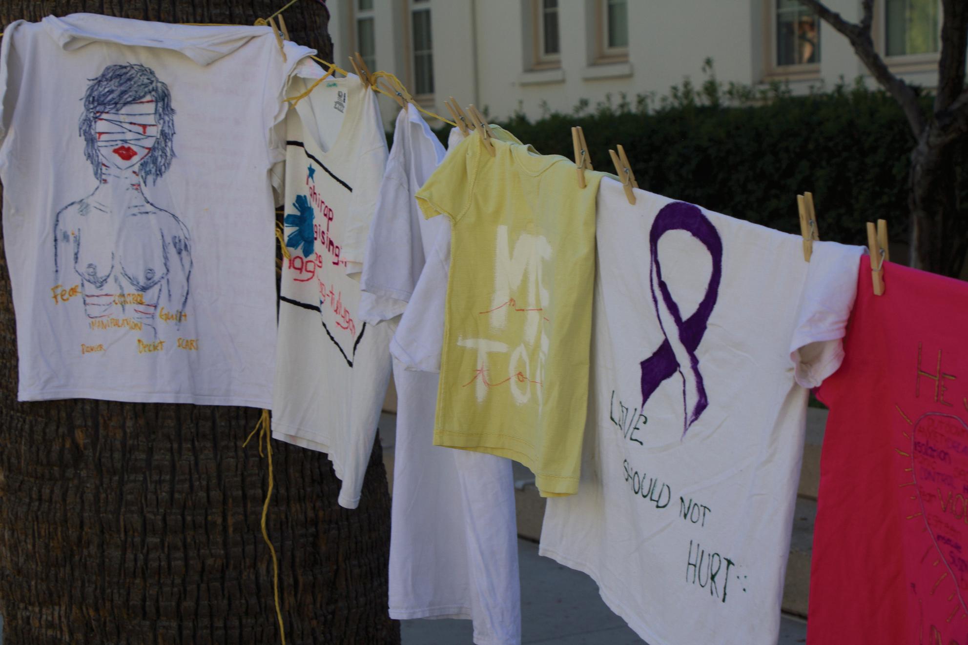 San José State students made T-shirts on Wednesday for the Clothesline project and strung them up all along 7th Street Plaza.