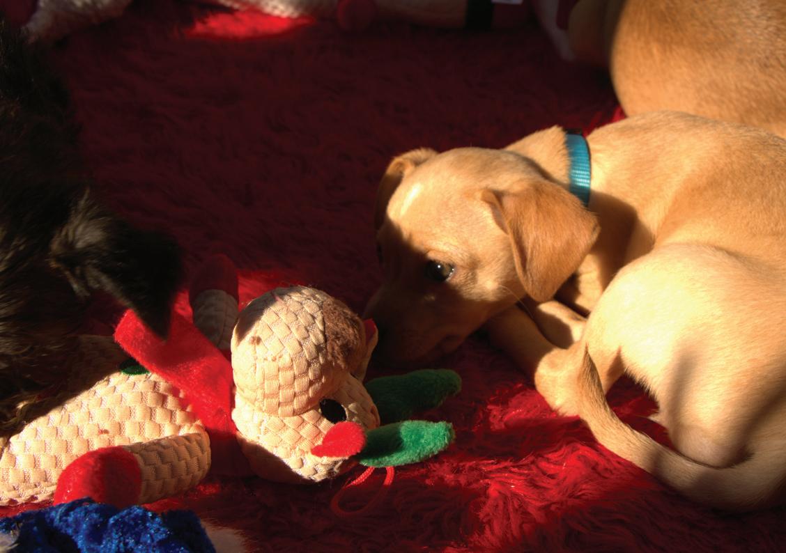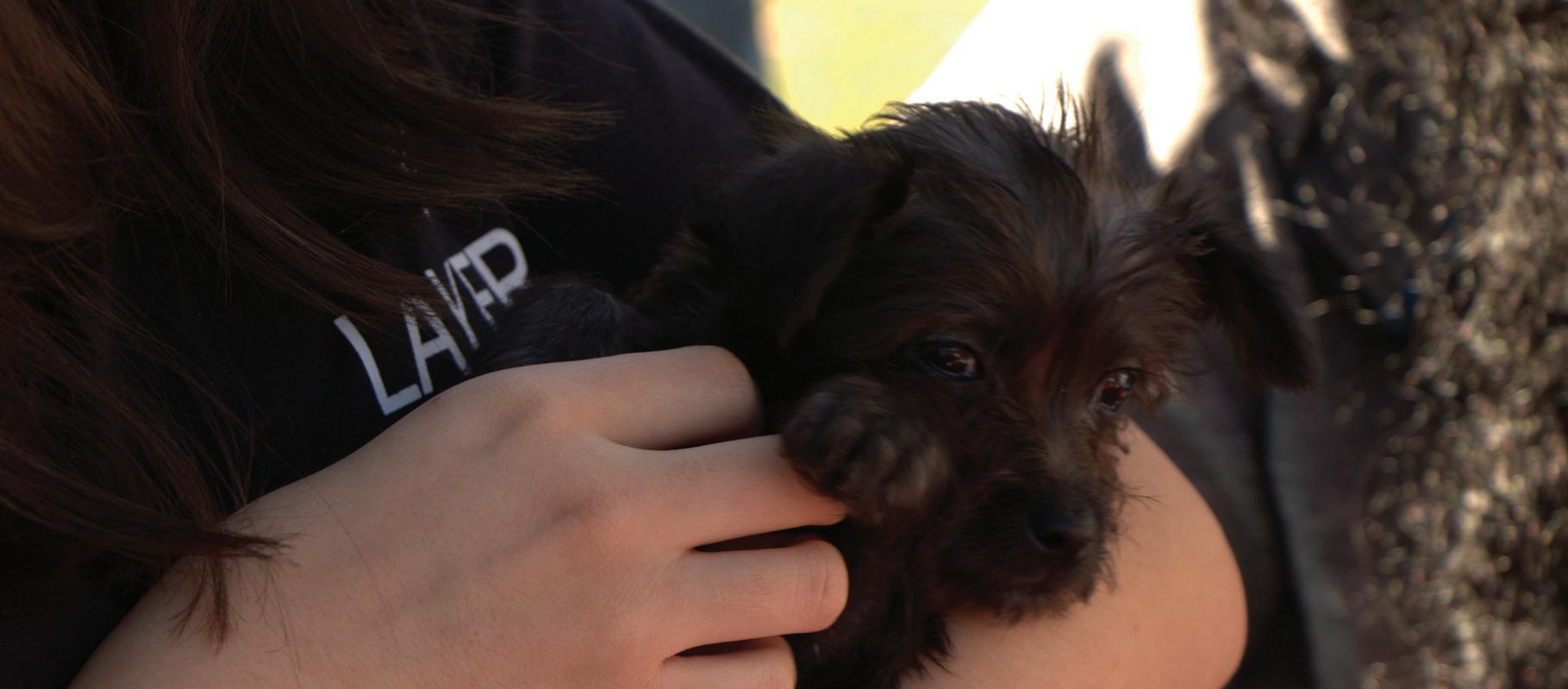 #1: Cinderella leans on Ariel while she looks up at a student petting her at San José State’s puppy petting zoo.