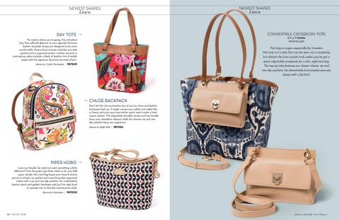 ! CHLOE BACKPACK Don’t let the chic-and-petite size of our lux, linen and leather backpack fool you. It easily carries your tablet and wallet like a champ and puts your keys within quick reach inside a front zipper pocket. The adjustable shoulder straps and top handle keep your shoulders relaxed, while the interior zip and two slip pockets keep you organized. shown in High Ebb | 957224