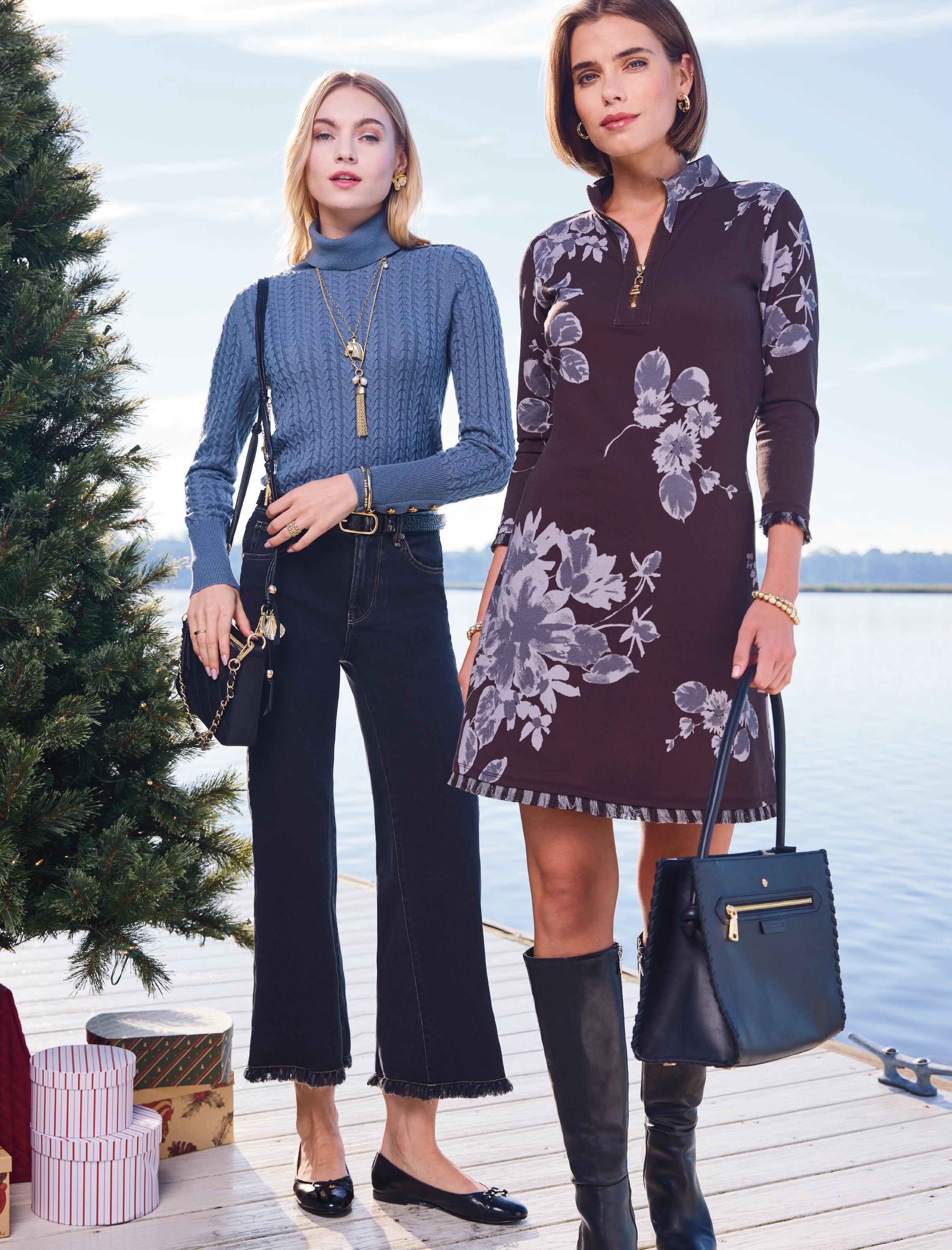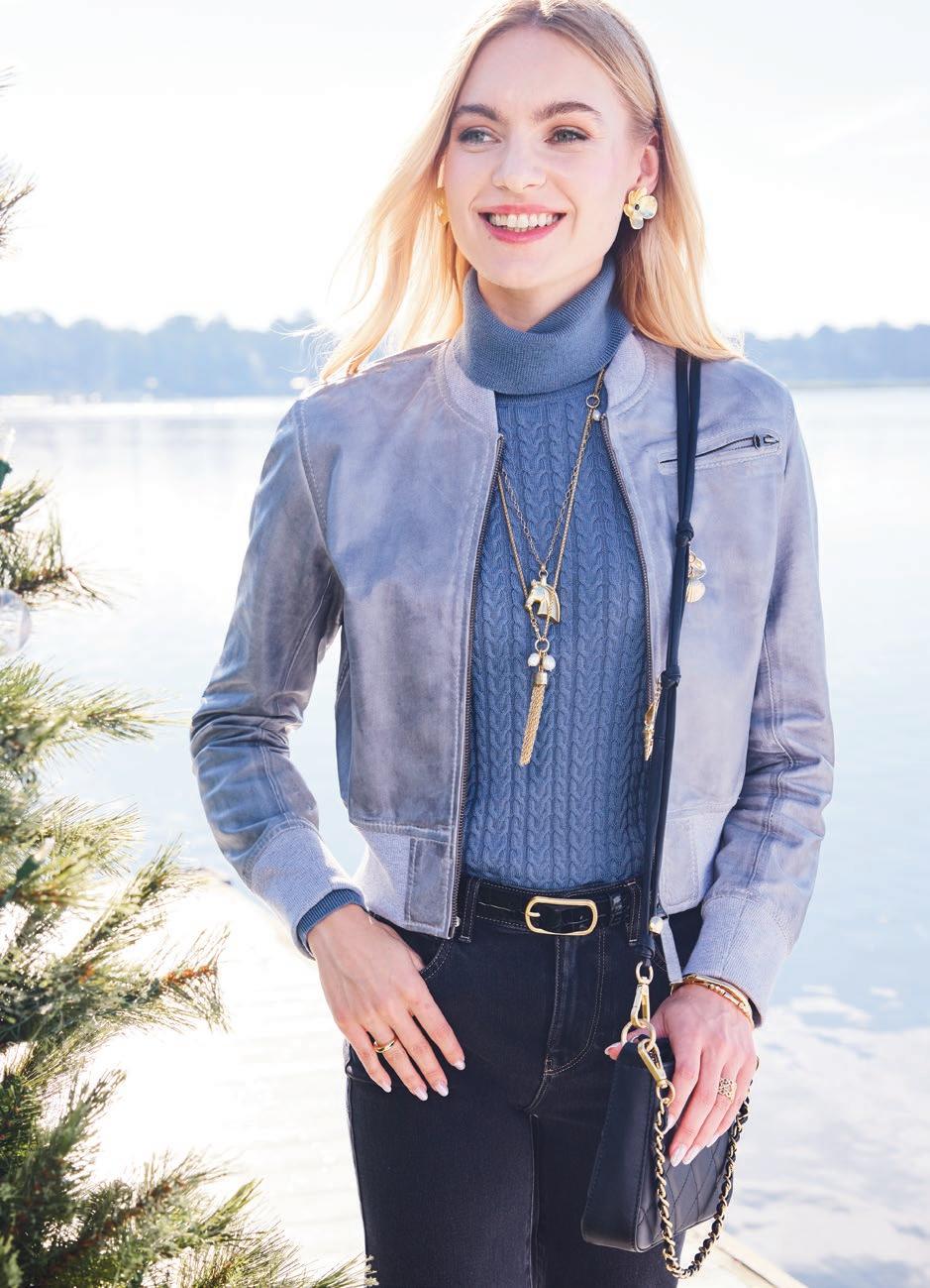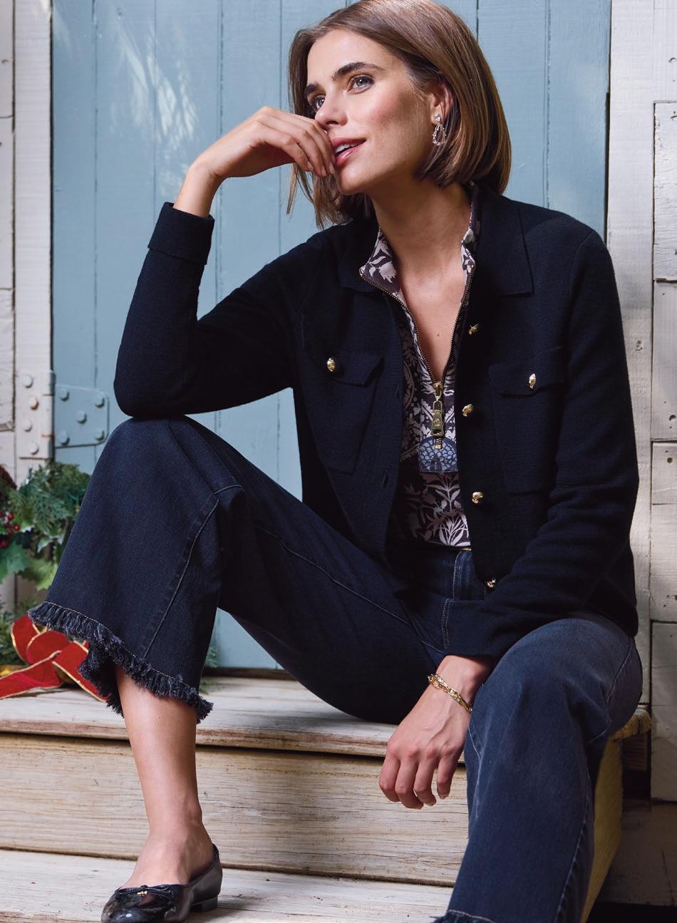 Maya Half-Zip Sweater Warm Beige $228 | Ramona Tweed Blazer Black Multi $218 | Faye Denim Trouser Midnight Marina Rinse Wash $158 | Siren Thin Belt Croc Black $78 | Kyle Jacket Pewter $455 | Maya Half-Zip Sweater Warm Beige $228 | Siren Thin Belt Matte Gold $78 | Florence Crewneck Sweater Blue Silver Foil $198 | Maren Kick Flare Pant Etta Damask Ink $148 | Sinclair Shoulder Black $198