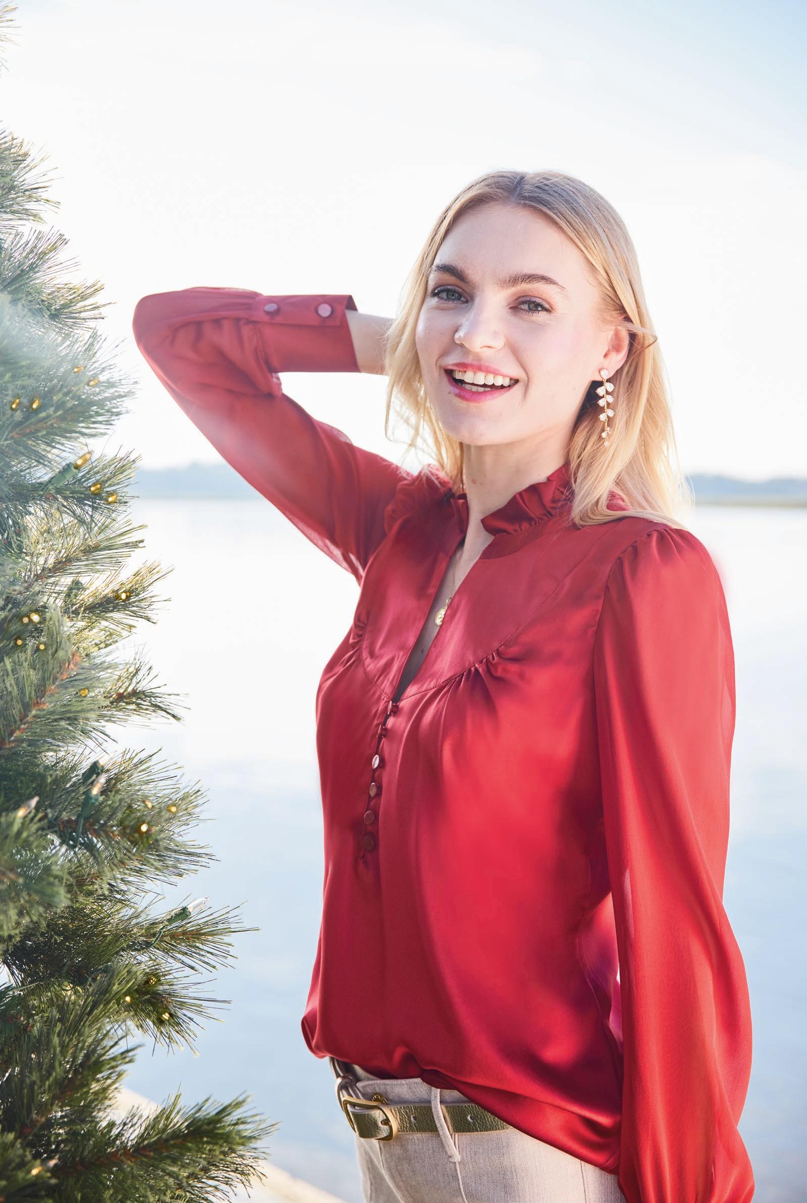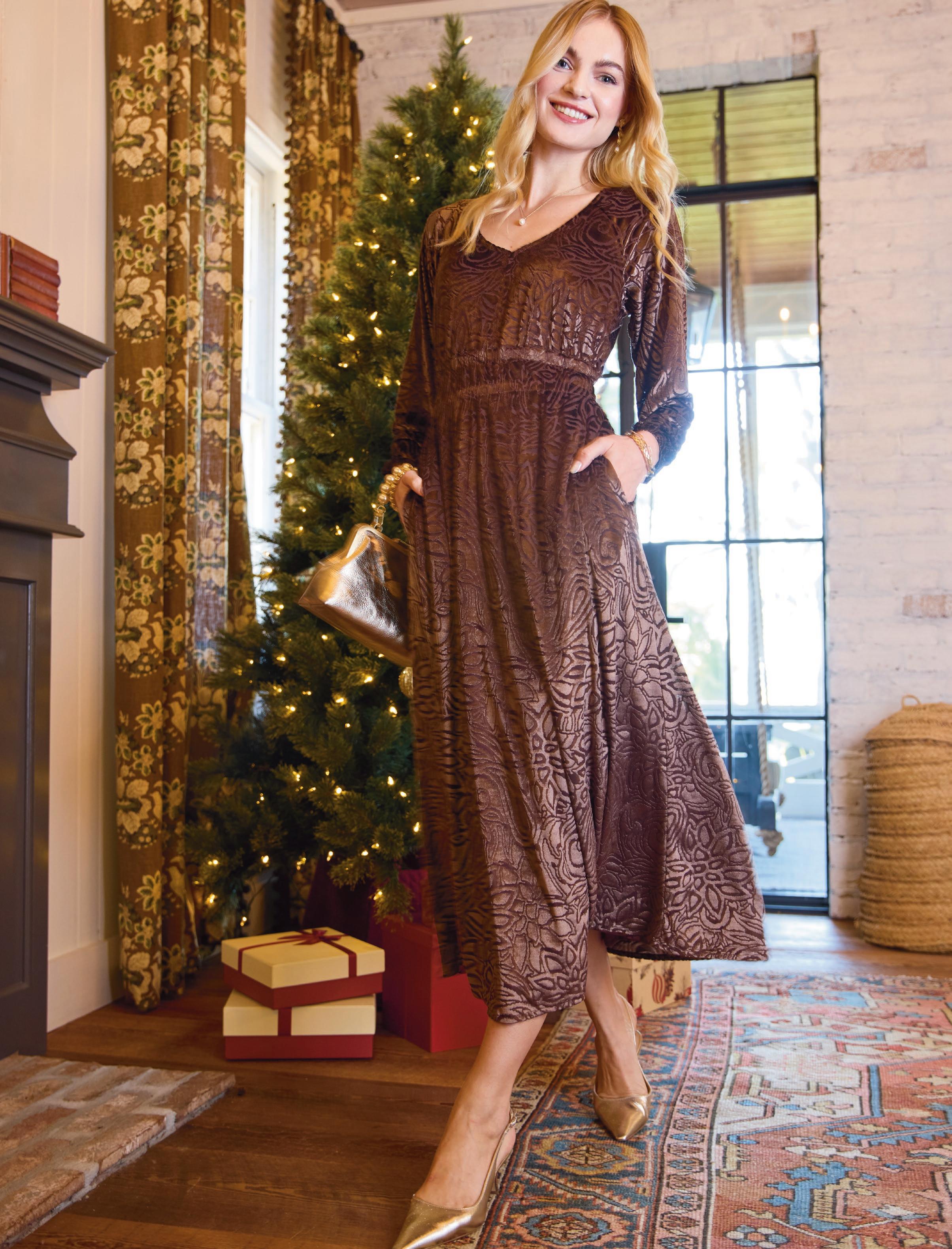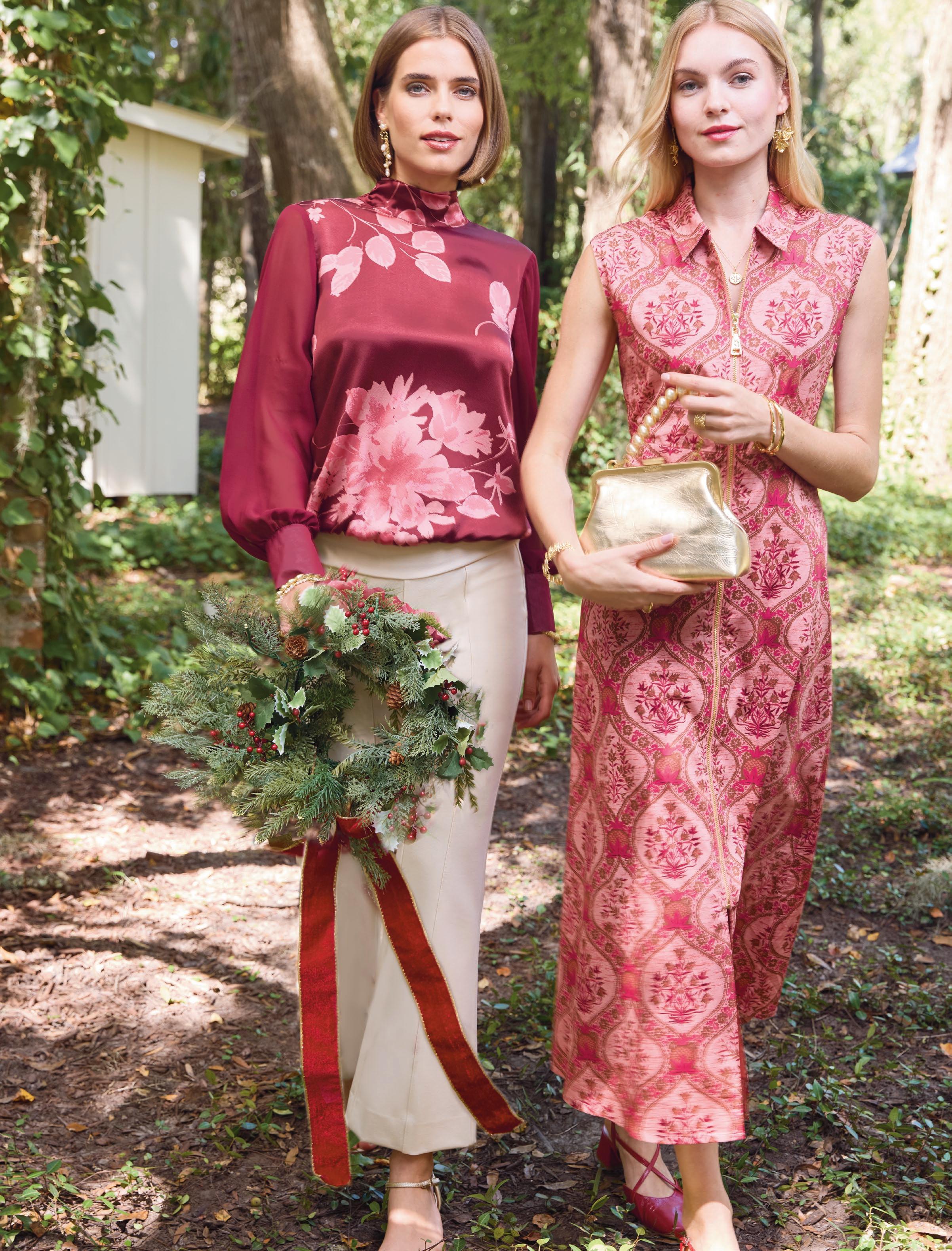 Opposite: Erinne Silk Blouse Etta Floral Bordeaux $218 | Brooke Pull-On Ponte Trouser Alabaster $148 | Pearl Party Tassel Earrings $58 | Lainey Shirt Dress Etta Damask Pomegranate $248 | Cali Clutch Gold $210 | Magnolia Earrings $38 | Assorted Jewelry – Shop Online