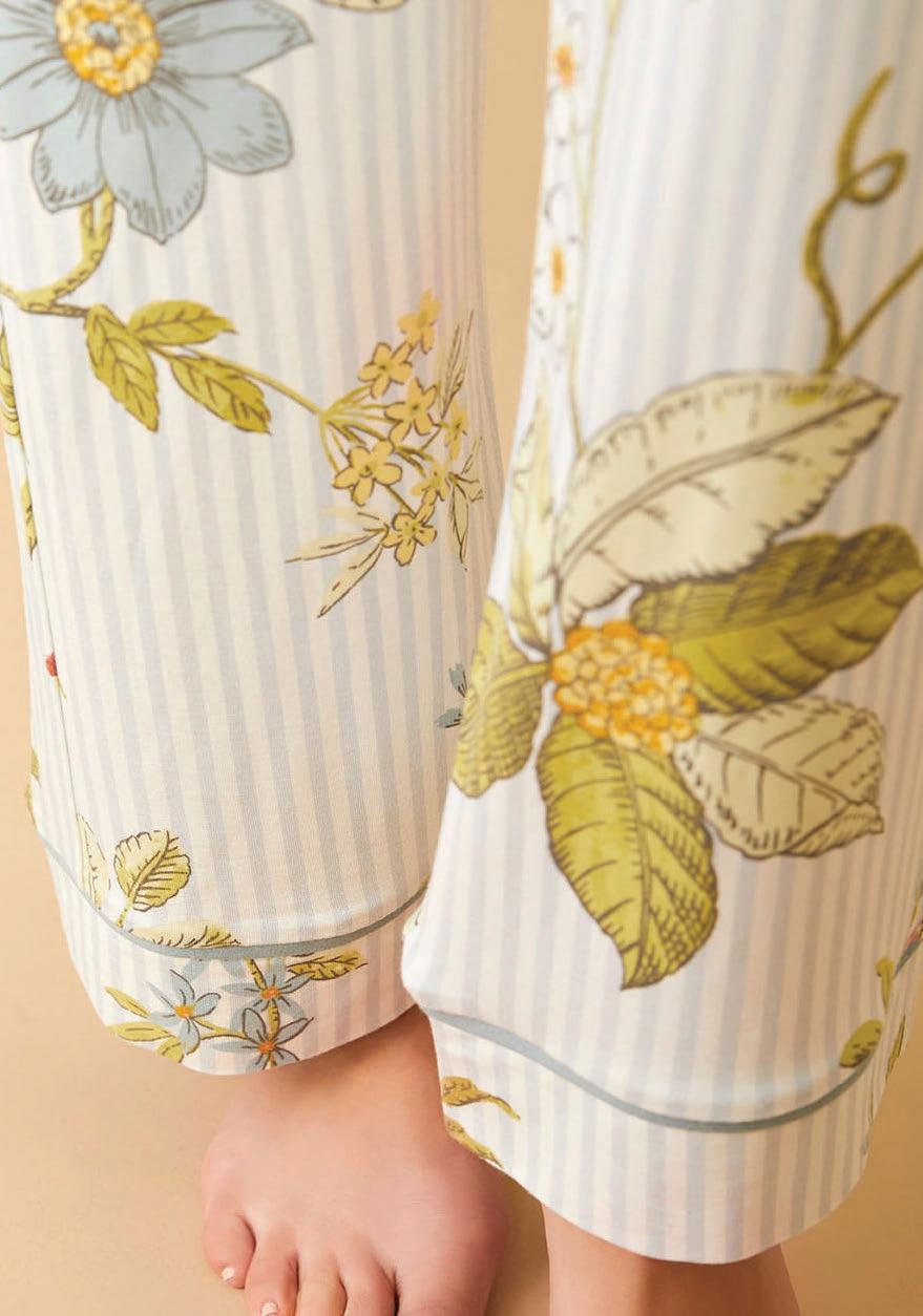 PAJAMAS & GIFTS Pajama prints featured: Palm Scene Blue , Jane Jacobean Cream, Overboard Coastal Dreams, Flamingos, Floral Vine Stripe Blue