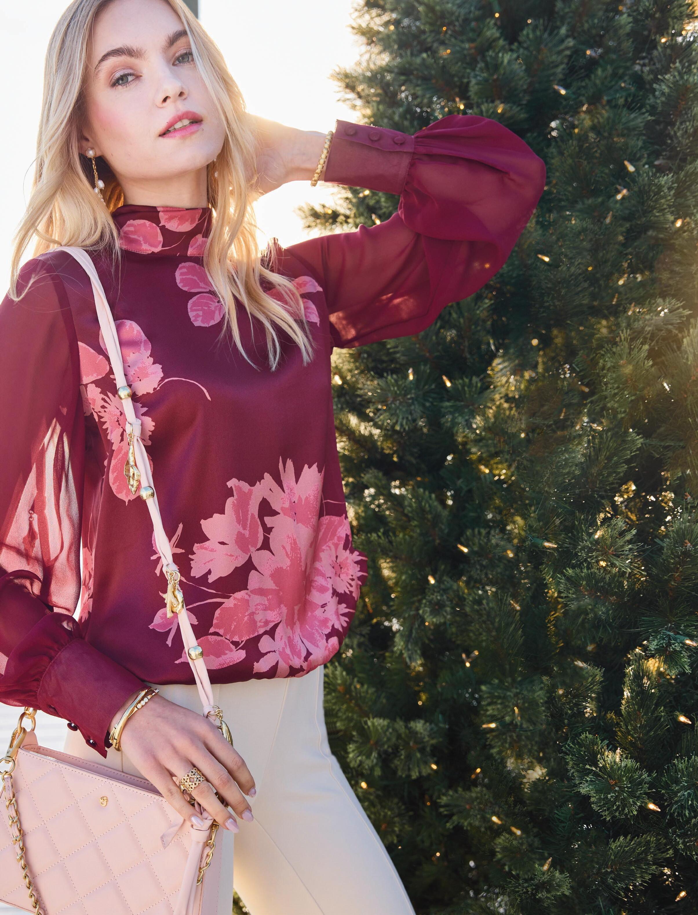 Irene Midi Dress Etta Floral Bordeaux $258 | Cali Clutch Gold $210 | Tassel Convertible Lariat Necklace $98 | Raquelle Sweater Etta Floral Pink $198 | Mallory Kick Flare Jean Metallic Champagne $158 | Diana Short