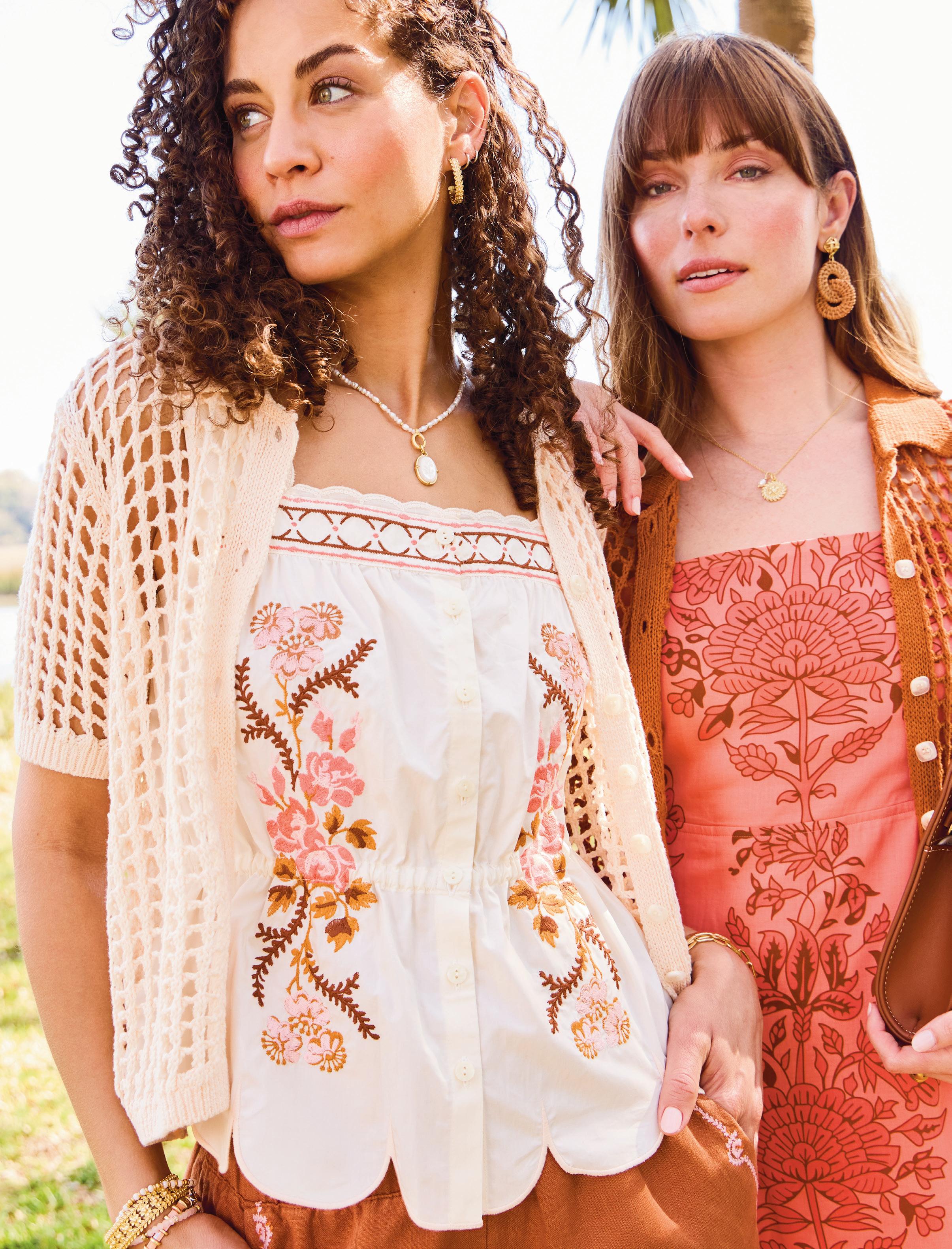 Lea Midi Dress McAllister Paisley $228 | Karina Chain Necklace 18” $88 | Coastal Dreams Necklace 18” $42 | Blooming Gem Earrings Pink $48 | Natalee Midi Dress McAllister Boho Gold $298 | Charm Necklace Collector $250 | Parkwood Cuff $48 | Parkwood Midi Hoop Earrings $34 | Grand Stretch Bracelet $44 | Assorted Jewelry – Shop Online