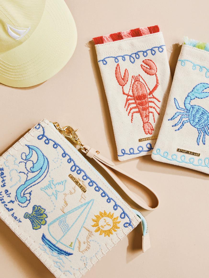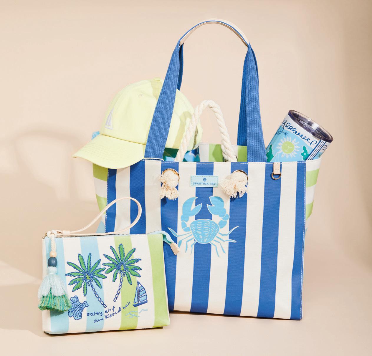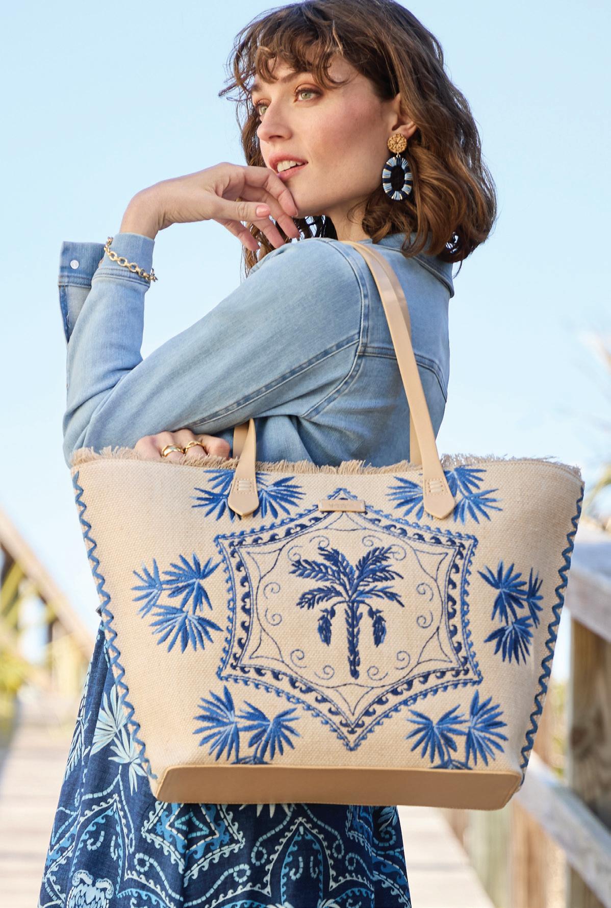 Jacket Calibougue Wash $168 | Beach Tote Ogeechee Palm Medallion $118 | Fiesta Tote Crab $138 | Straw Oval Earrings Blue $32