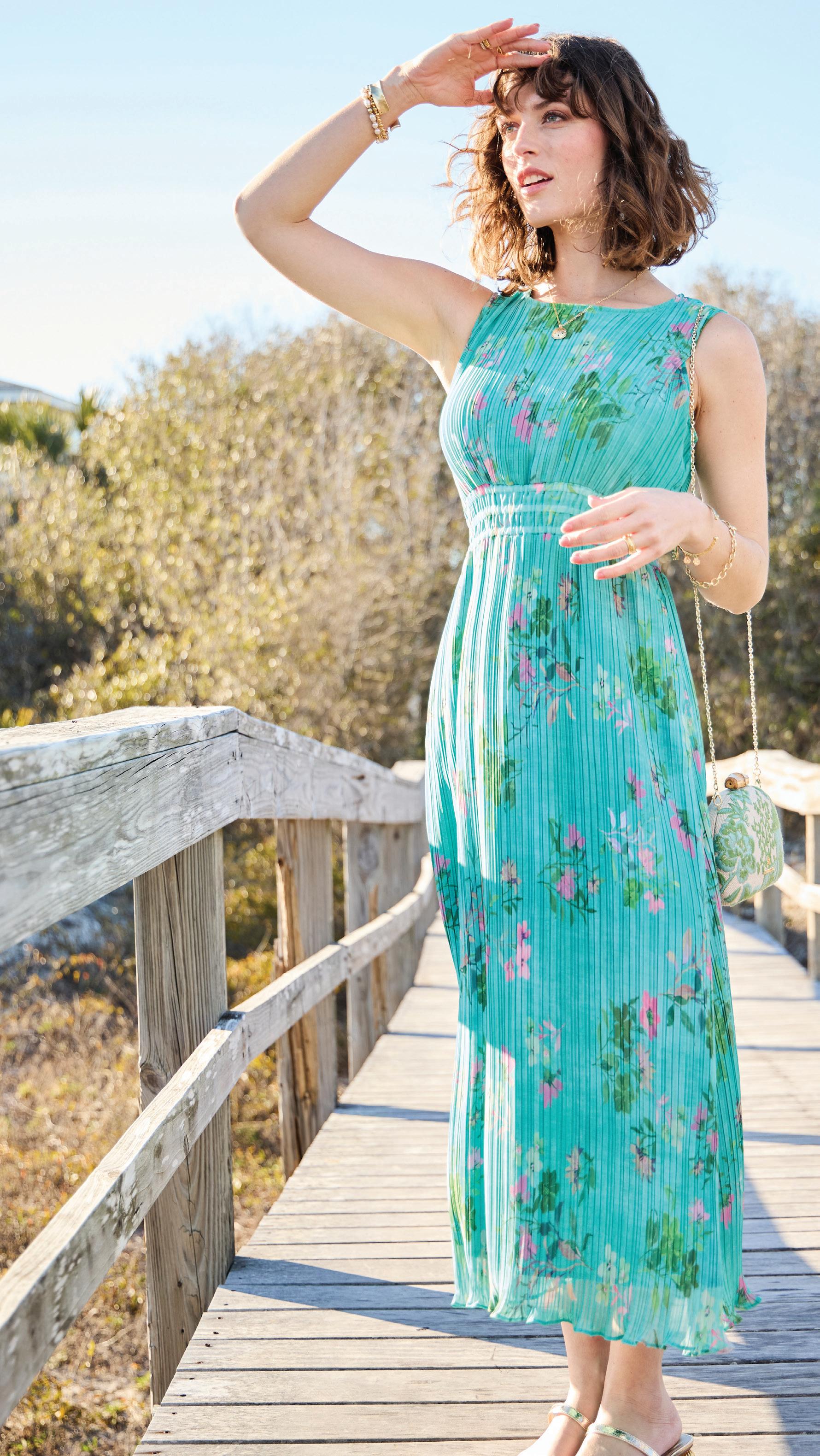 Andie Midi Dress Ogeechee Tropical Leaf $228 | Coral Embroidered Clutch Bascom $124 | Happy Daisy Cuff $52 | Spring Tulip Earrings $24 | Assorted Jewelry – Shop Online