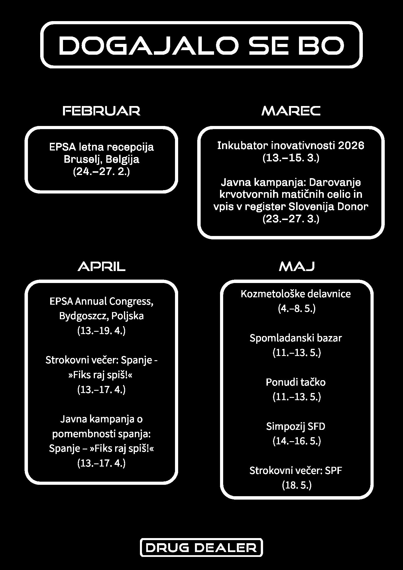 Posebno zahvalo namenjam lektorjem, oblikovalcem in vsem, ki ste sodelovali pri tehnični pripravi in tisku – vaše delo pogosto ostaja v ozadju, a je ključno za kakovost in podobo vsake številke. Zahvaljujem se tudi vsem podjetjem, organizacijam in posameznikom, ki ste skozi leta omogočali nastanek Spatule, tako s finančno podporo kot s sodelovanjem in zaupanjem v Društvo študentov farmacije Slovenije.