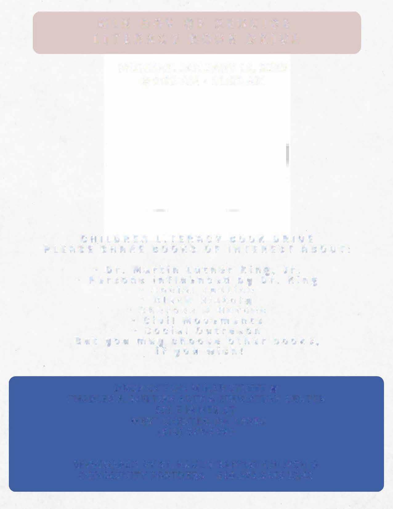 MLK DAY OF SERUICE LITERACY BOOK DRIUE MONDAY, JANUARY16, 2023 @ 9:00AM - 11:00AM CHILDREN LITERACY BOOK DRIVE PLEASE SHARE BOOKS OF INTEREST ABOUT: • Dr. Martin Luther King, Jr. - Persons influenced by Dr. King • Social Justice • Black History - Sheroes & Heroes - Civil Movements - Social Outreach But you ma_y choose other books, 1f you wisht DROP OFF ON MINER STREET@ CHARLES A. MELTON ARTS & EDUCATION CENTER 501 E MINER ST WEST CHESTER, PA 19382 (610) 692-9290 SPONSORED BY ST. PAUL'S BAPTIST CHURCH & COMMUNITY PARTNERS 610.692.2446 X140 12