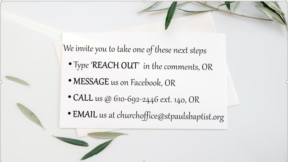 ļ¶ Any item of informaļæ½on for Pastoral Emphasis, or if you are requesļæ½ng to make an announcement on Sunday, must be submited by noon on Friday. You may either call 610.692.2446 Ext. 140 or email your announcement informaļæ½on to churchoļ¬ce@stpaulsbapļæ½st.org. We realize that things do happen between Friday and Sunday and that the need may arise wherein someone has to get a note to Pastor. However, in an eļ¬ort to give Pastor minimal distracļæ½ons on Sunday mornings as he prepares for worship, aside from an emergency, please refrain from sending a note to Pastor requesļæ½ng that he make an announcement.
