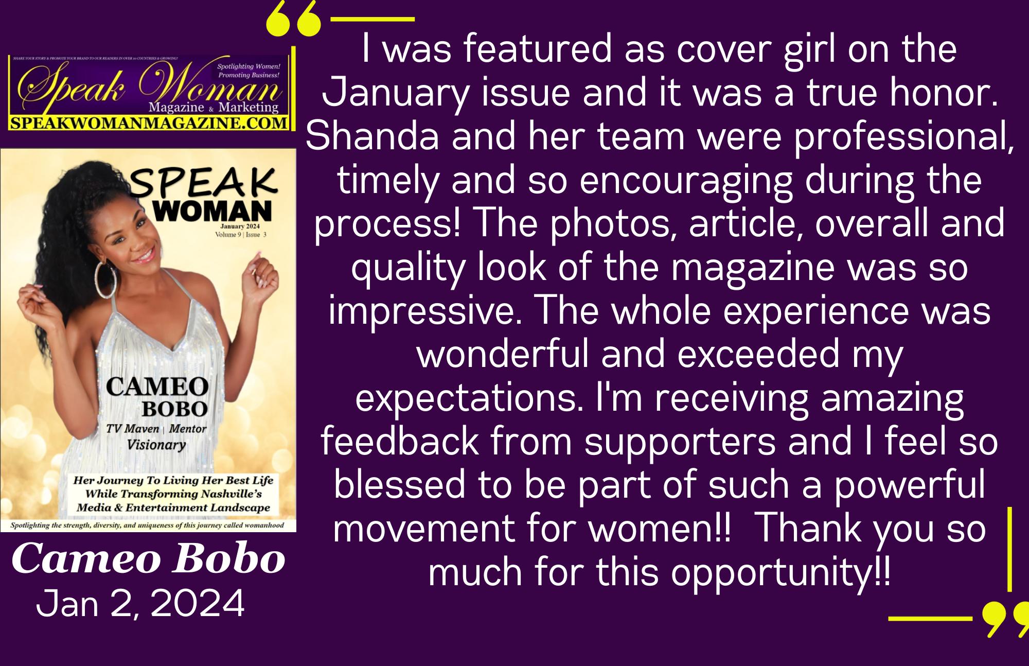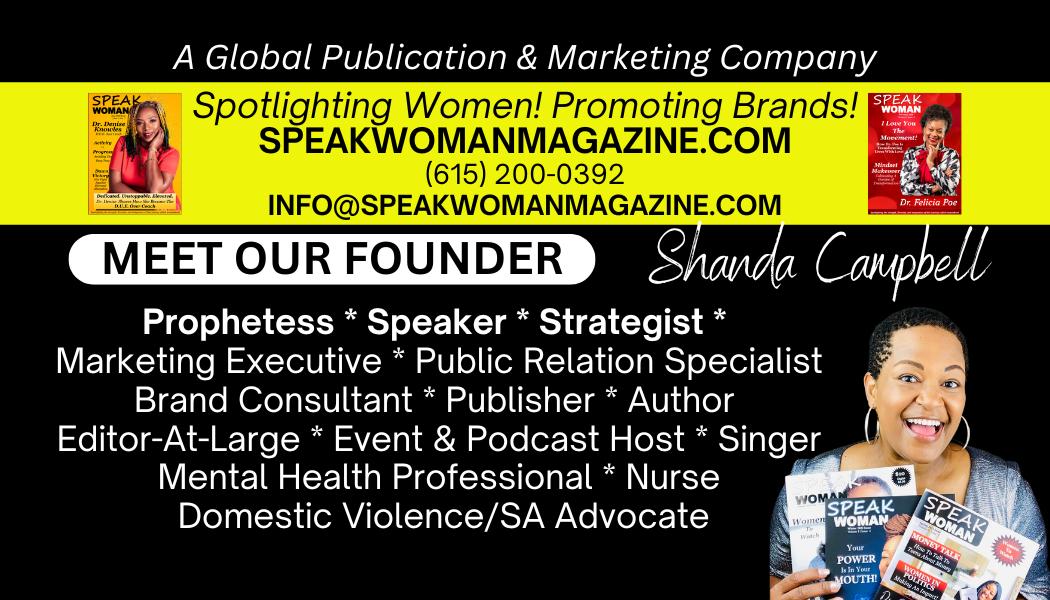 Speak Woman Magazine strives to publish correct and accurate information. We do not accept liability for any inaccuracies. The views expressed in published articles are that of the author and do not necessarily represent the views of Speak Woman. Actions based on information in Speak Woman are at your own risk. Reproduction of any part of this publication without prior written consent is prohibited. Trademark Property of Speak Woman Magazine, LLC ~ Publisher: Speak Woman Magazine, LLC