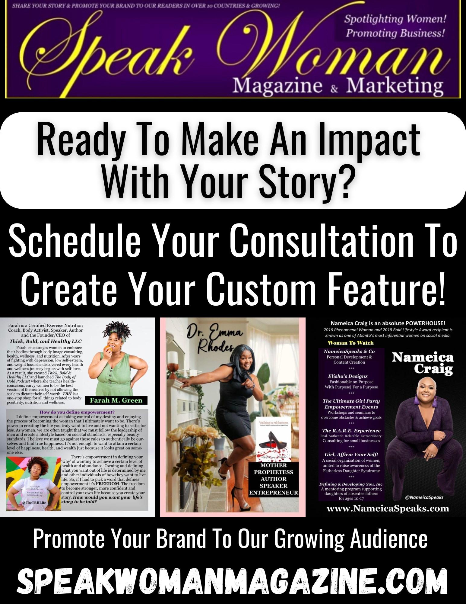 Shanda Campbell, Editor-At-LargeSpeak Woman Magazine strives to publish correct and accurate information. We do not accept liability for any inaccuracies. The views expressed in published articles are that of the author and do not necessarily represent the views of Speak Woman. Actions based on information in Speak Woman are at your own risk. Reproduction of any part of this publication without prior written consent is prohibited.